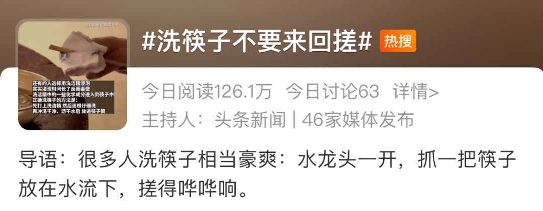 为什么说洗筷子不要猛搓?多数家庭洗筷子的方式很“豪迈”:抓着一把筷子用洗洁精猛搓几下,然后用清水冲洗,事实上这样很容易使筷子尤其是没有保护层的“裸筷”变粗糙,产生许多细小的凹槽、裂纹,使致病微生物残留。