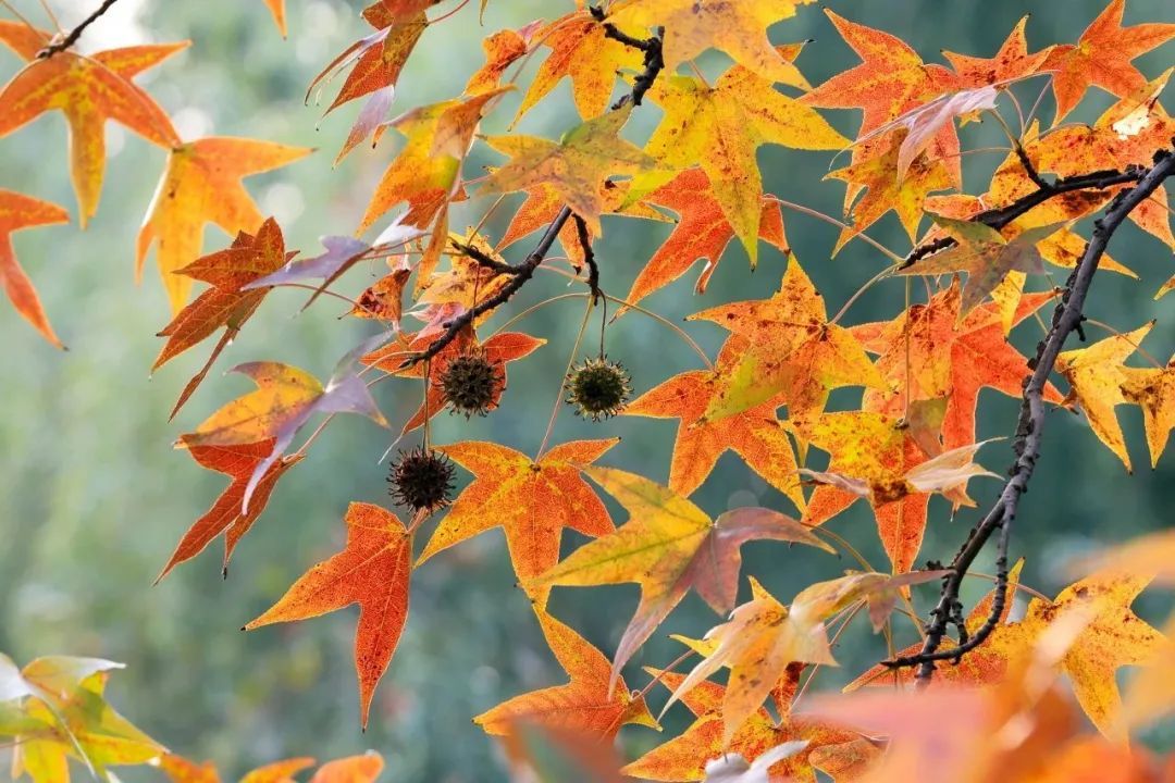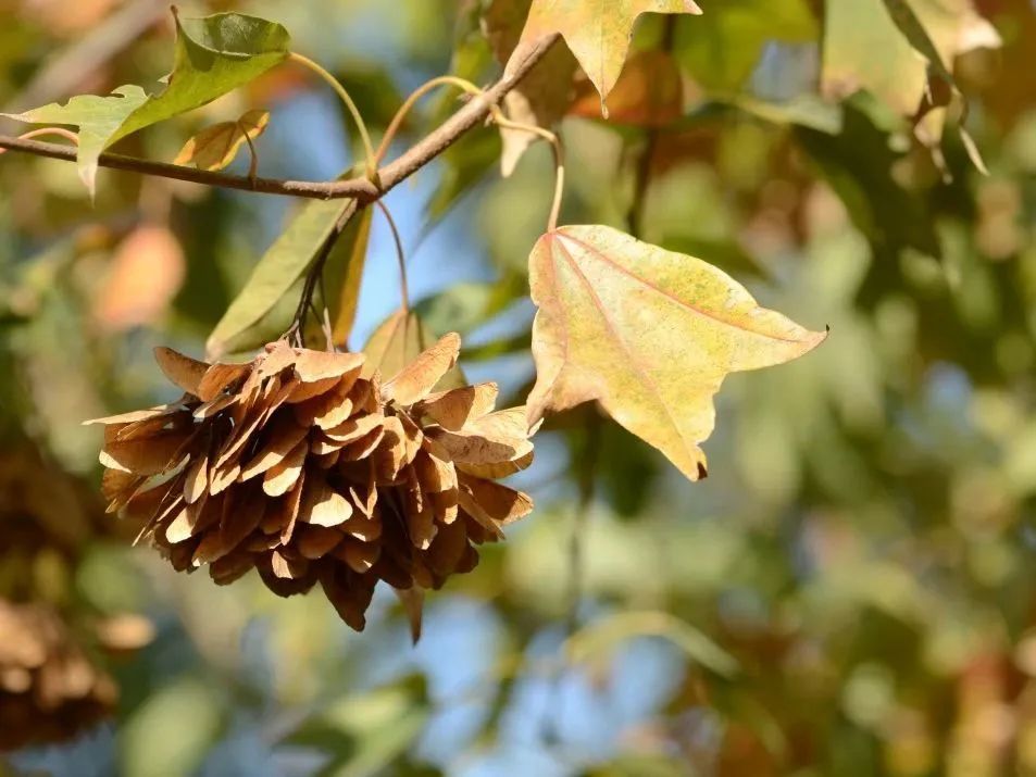 枫香树的叶子呈掌状三裂,在秋季变黄变红,冬季凋零。除了叶子美观,枫香树的果也很有特色。在这个季节,可以看到圆圆的头状果序像铃铛一样垂于树间,随着风起摇曳。所幸的是,这个“小铃铛”并不会像悬铃木的果球一样飞毛,还可以入药,在中医药学上有个好听的名字,叫“路路通”。