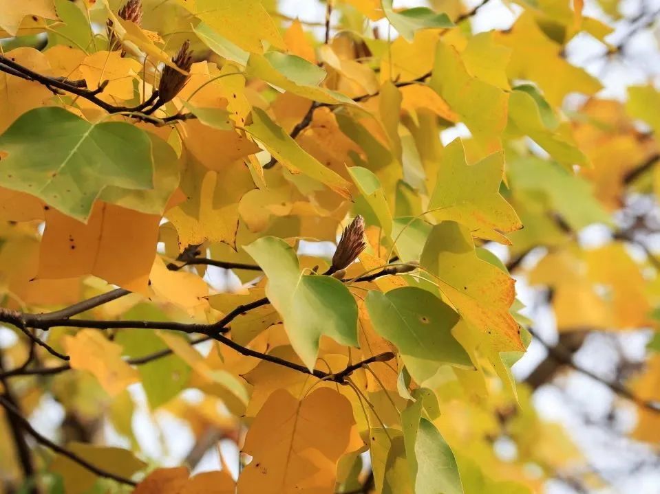在秋天,还有一种泛着金黄的秋叶,来自一种起源于白垩纪,跟银杏一样幸存于第四纪冰川演化至今的孑遗植物——鹅掌楸。鹅掌楸Liriodendron chinense是中国的原生种,因为叶型酷似中国传统服饰马褂而被中国人亲切地称为“马褂木”。在深秋,“马褂”变成了“黄马褂”,更添“贵气”,在云雾山路上就挂着耀眼的“黄马褂”哦。