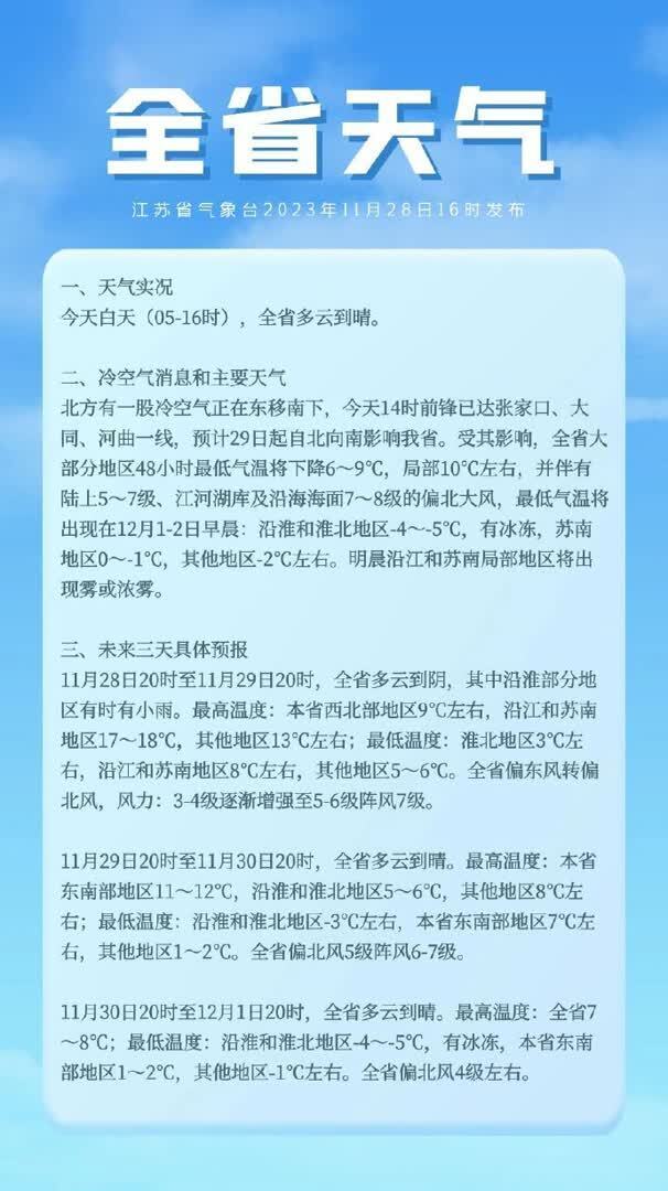11月28日20时至11月29日20时,全省多云到阴,其中沿淮部分地区有时有小雨。最高温度:本省西北部地区9℃左右,沿江和苏南地区17~18℃,其他地区13℃左右;最低温度:淮北地区3℃左右,沿江和苏南地区8℃左右,其他地区5~6℃。全省偏东风转偏北风,风力:3-4级逐渐增强至5-6级阵风7级。 11月29日20时至11月30日20时,全省多云到晴。最高温度:本省东南部地区11~12℃,沿淮和淮北地区5~6℃,其他地区8℃左右;最低温度:沿淮和淮北地区-3℃左右,本省东南部地区7℃左右,其他地区1~2℃。全省偏北风5级阵风6-7级。 11月30日20时至12月1日20时,全省多云到晴。最高温度:全省7~8℃;最低温度:沿淮和淮北地区-4~-5℃,有冰冻,本省东南部地区1~2℃,其他地区-1℃左右。全省偏北风4级左右。
