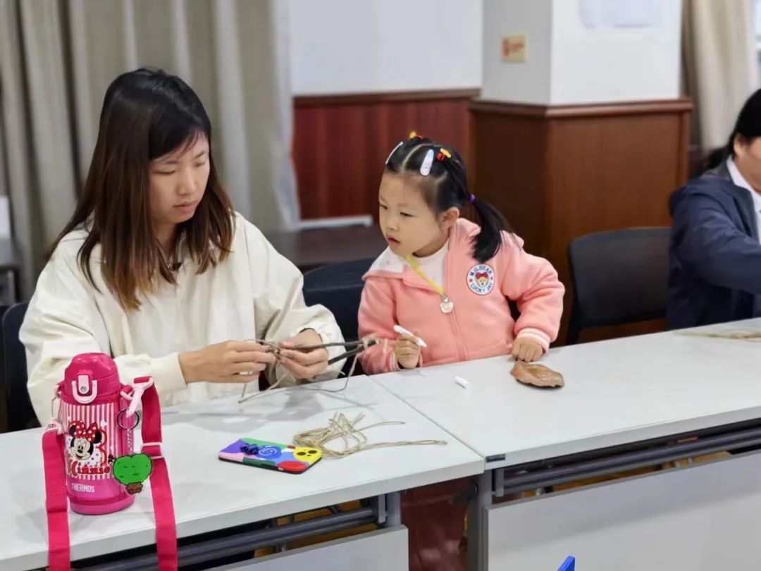 活动现场,老师向萌娃们细致讲解了此次手工制作的步骤和技巧,并展示了手工成品——捕梦网,在老师的指导和帮助下,萌娃们很快掌握了制作要点,绕绳、打结、串珠……每一组亲子家庭间的合作都十分融洽。