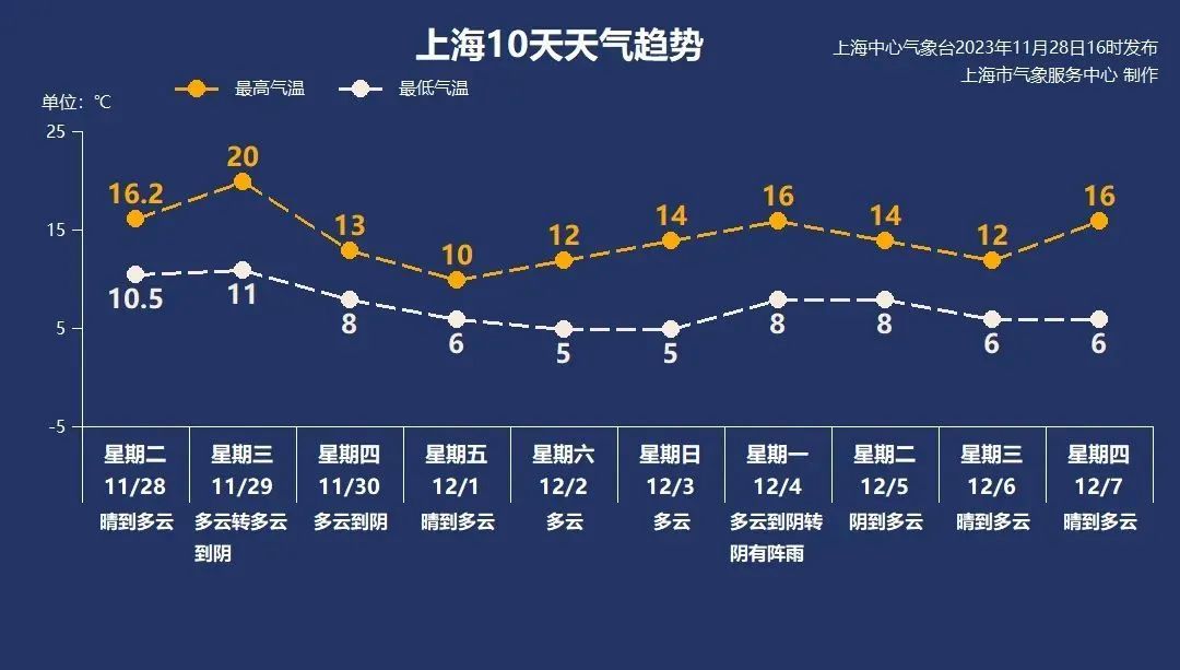 明天(11月30日)早间最低气温降至8℃,全天气温不超过13℃。后天(12月1日)全天气温在10℃以内。预计双休日早晨将出现近期的气温最低值,市区仅5℃左右,个别郊区跌至冰点。