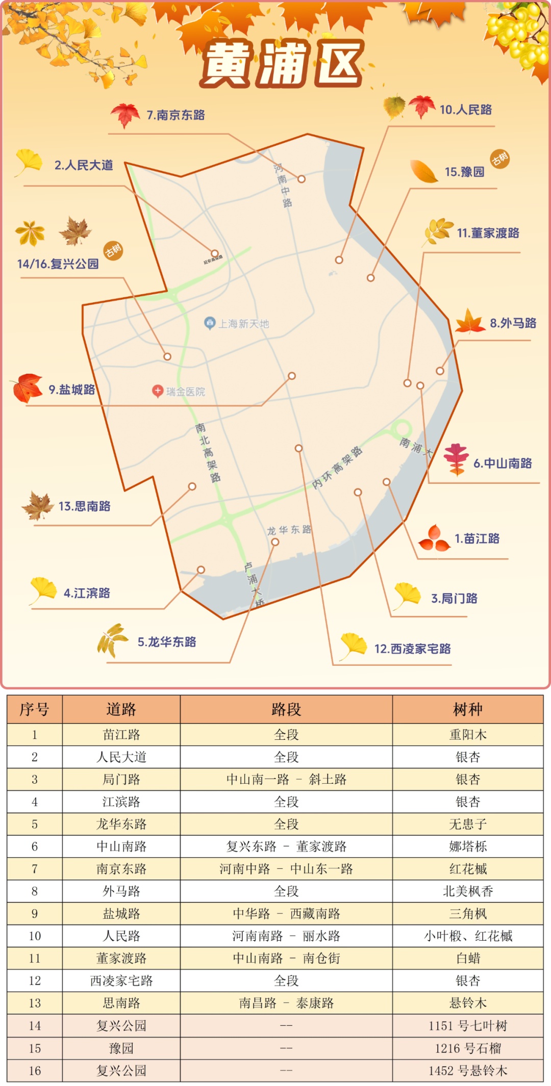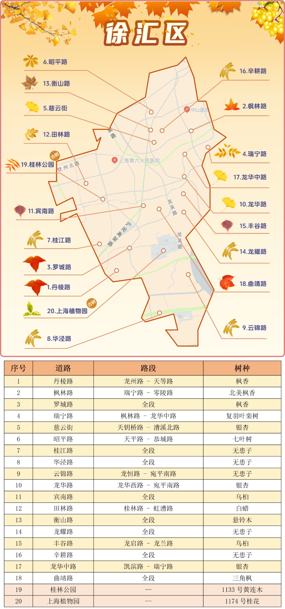 眼下的魔都,美得深邃。市绿化市容局为大家准备了一份上海赏秋必备地图,内有177条秋色景观道路和11个古树名木推荐点,邀你赴一场浪漫的约定: