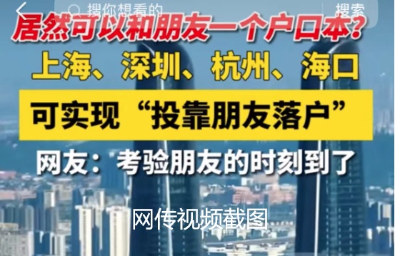 近日,#居然可以和朋友一个户口本#的相关话题登上热搜。网传视频称,只要满足一定的条件,在上海、深圳、杭州、海口等城市可实现“投靠朋友落户”。