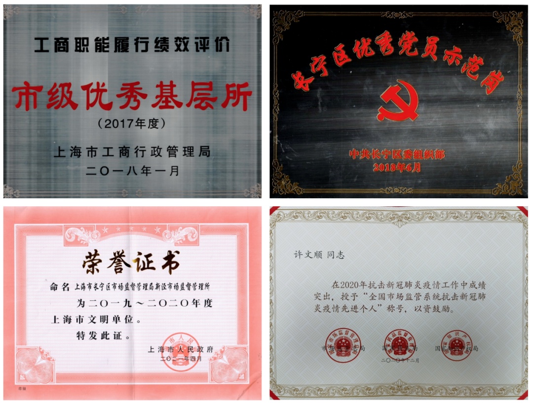 自成立以来,新泾所一直在领先路上奋进。全体干部锤炼品格、提升本领、履职尽责、担当作为,已连续十一届、22年荣获“上海市文明单位”称号,曾先后荣获长宁区机关先进党支部、区优秀党员示范岗、区局先进党支部、先进集体等称号,承办的案件荣获上海市市场监督管理局第二届“十佳案件”,上海市“建设市民满意的食品安全城市”先进个人、市市场监管系统青年五四奖章、市市场监管系统“优秀志愿者”等称号。