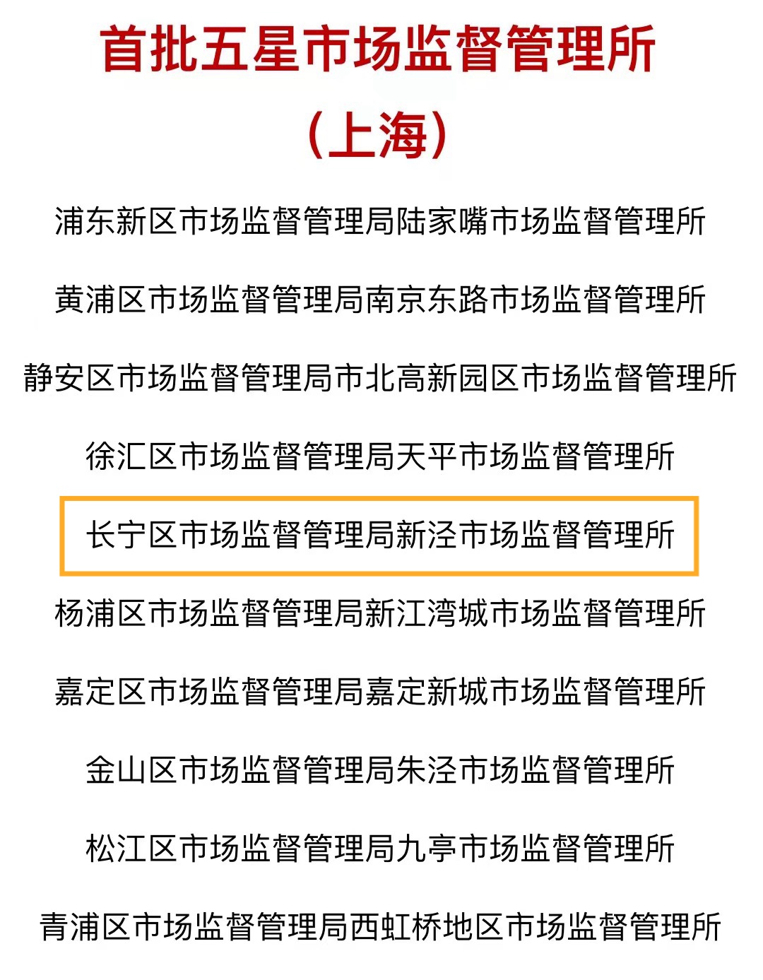 近日,市场监管总局印发《关于五星市场监督管理所评定结果的通报》,公布首批五星市场监督管理所名单。经过综合评定,上海共有10个市场监督管理所被评定为五星市场监督管理所,长宁区市场监督管理局新泾市场监督管理所入选。