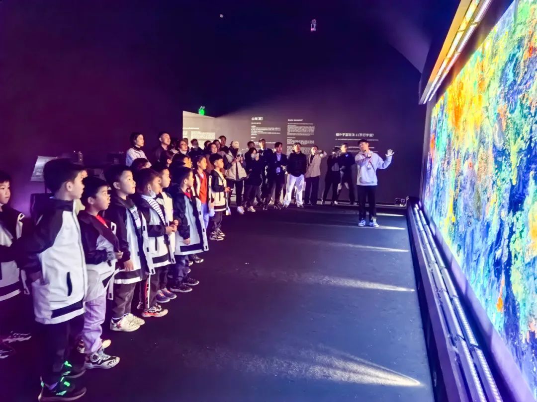 步入“山海密藏”展厅,首先映入眼帘的是10米巨幅“山海图”。它在不同的光源下,呈现“表世界”和“里世界”两种状态,吸引了不少孩子驻足。通过观看多媒体展示和老师的讲解,孩子们了解到,《山海经》是一部中国古代的神话传说集合,描述了各种奇幻的山川和神兽。之后,同学们进入到雕塑作品展区,看到了很多栩栩如生的山海神兽艺术作品,感受了一场上古天地带来的沉浸式文化体验。