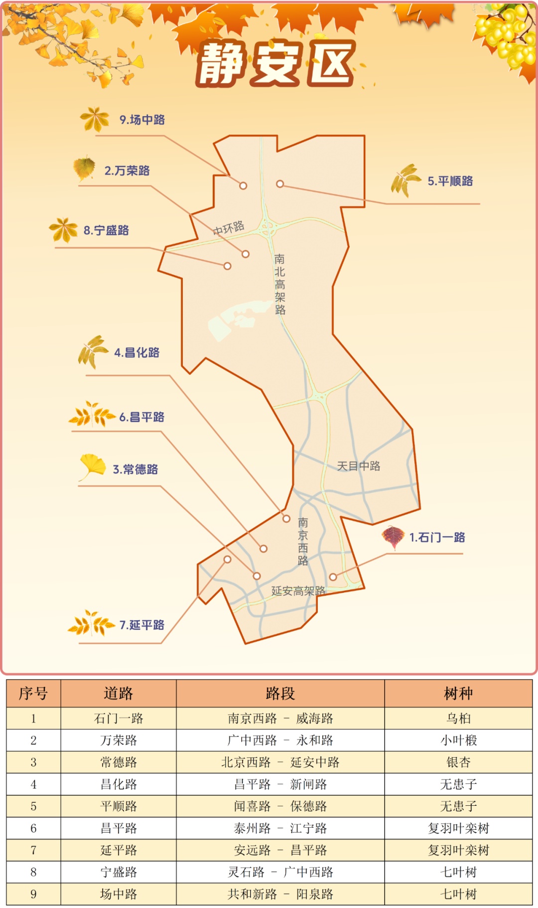 2019年,静安区绿化市容局对石门一路进行绿化景观提升,在更新行道树时将刺槐调整为乌桕,营造乌桕树“春季繁花似锦,秋季红叶似火”的景观面貌。