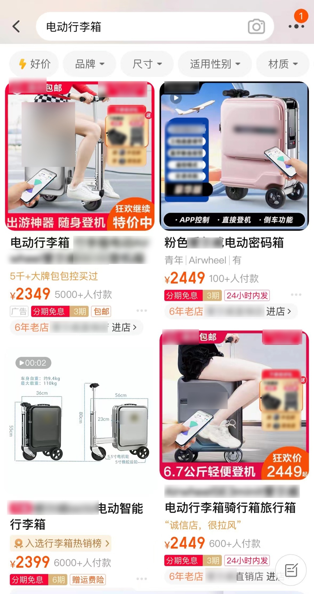 这里提到的电动行李箱,被不少人称为“网红代步神器”。按一下键,行李箱上伸出一个智能把手,人直接坐在箱体上,手扶着把手,行李箱变成代步神器,能载着人行驶或倒退。这类电动行李箱在网上走红,成为不少人穿梭于机场的吸睛神器。
