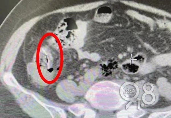 该院胃肠肛外科医师查体发现,她腹部压痛、反跳痛明显,肚子僵硬,血液检查显示白细胞严重超标,是腹膜炎的信号。腹部CT发现,胡大姐的小肠腔内有条状异物。