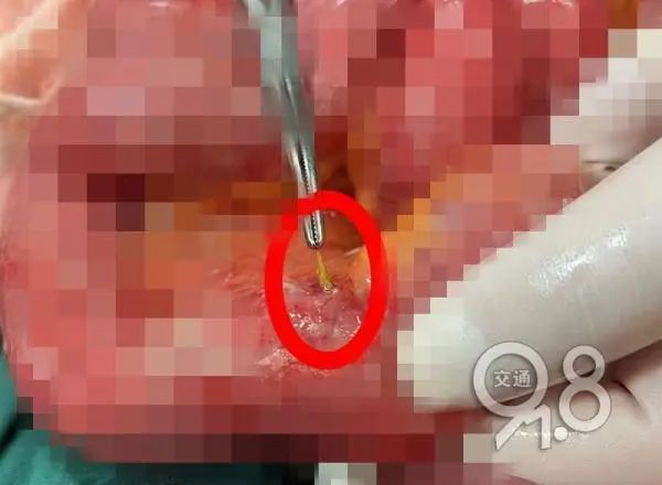 综合患者描述,医生判断其体内异物就是鱼刺,安排腹腔镜探查。在术中发现,胡大姐腹腔内已产生大量脓性腹水,回肠部有一根硕大的鱼刺穿破小肠,露出尖头,穿孔处的肠壁及系膜高度水肿。