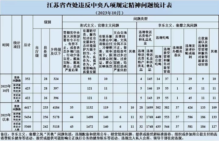 交汇点讯 11月30日,江苏省纪委监委通报,今年10月,全省共查处违反中央八项规定精神问题352起,批评教育帮助和处理425人、其中给予党纪政务处分422人。从问题类型看,查处形式主义、官僚主义问题103起、批评教育帮助和处理132人,查处享乐主义、奢靡之风问题249起、批评教育帮助和处理293人。从人员级别看,批评教育帮助和处理县处级干部28人、乡科级及以下人员397人。