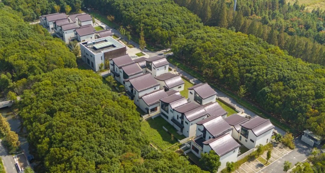 英科中心便坐落其中,占地300亩,距离黄浦江仅300米,主体由英科展示中心及6栋临湖办公院落构成。这是渔沥村利用村民集中“上楼”退出的位于涵养林内的宅基地,经规划调整转为商服用地,通过镇村两级与上海杭州湾经济技术开发有限公司联营的方式,打造出的“政府扶持+聚能产业+文创赋能”的生态链模式新标杆,如今已成为渔沥村试点探索宅基地改革和总部经济的标志性项目。2020年9月,上海英科实业有限公司下属英科环保、英科医疗正式入驻,目前每年落地税收3000万元,村级结算近300万元。