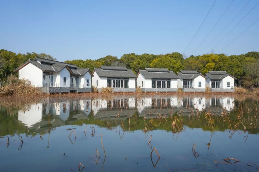 2019年,渔沥10组农户整体集中上楼居住后,在原来的范围内,打造出一片商务庭院办公群落,这便是“渔沥林盘”项目。该项目由知名设计团队操刀设计,2020年开始建设,整体用地面积1万平方米,共计16栋。在涵养林中,一幢幢“森林中的别墅”高低错落,庭院里树木掩映,阳光下,斑驳的树影与粉墙黛瓦的新江南建筑群和谐共存。