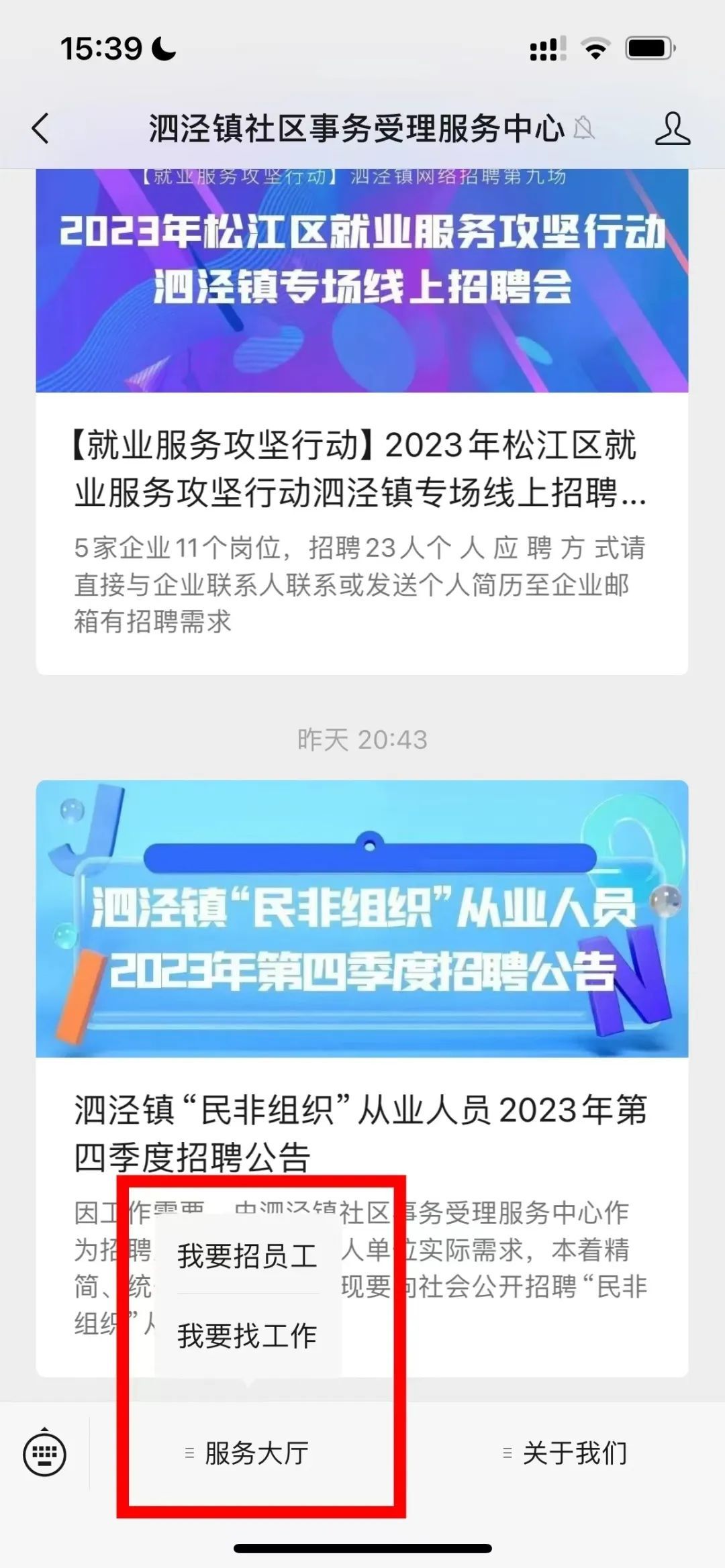 除了线下前往自助就业服务小站,市民也可关注“泗泾镇社区事务受理服务中心”微信公众号,找到右下角“服务大厅”,在线求职及招聘,实现就业服务“网上办”“掌上办”。