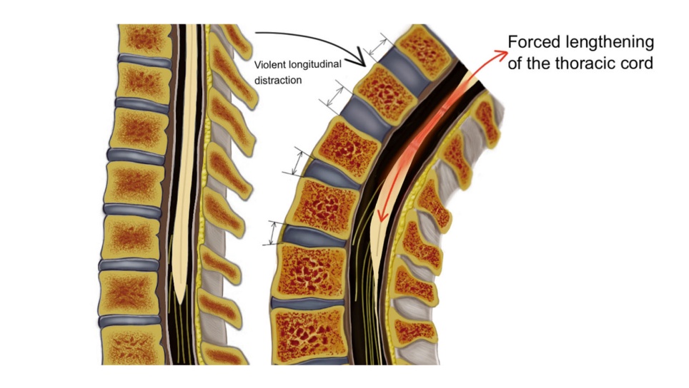 下腰动作后,脊髓受到纵向的轴性牵拉示意图