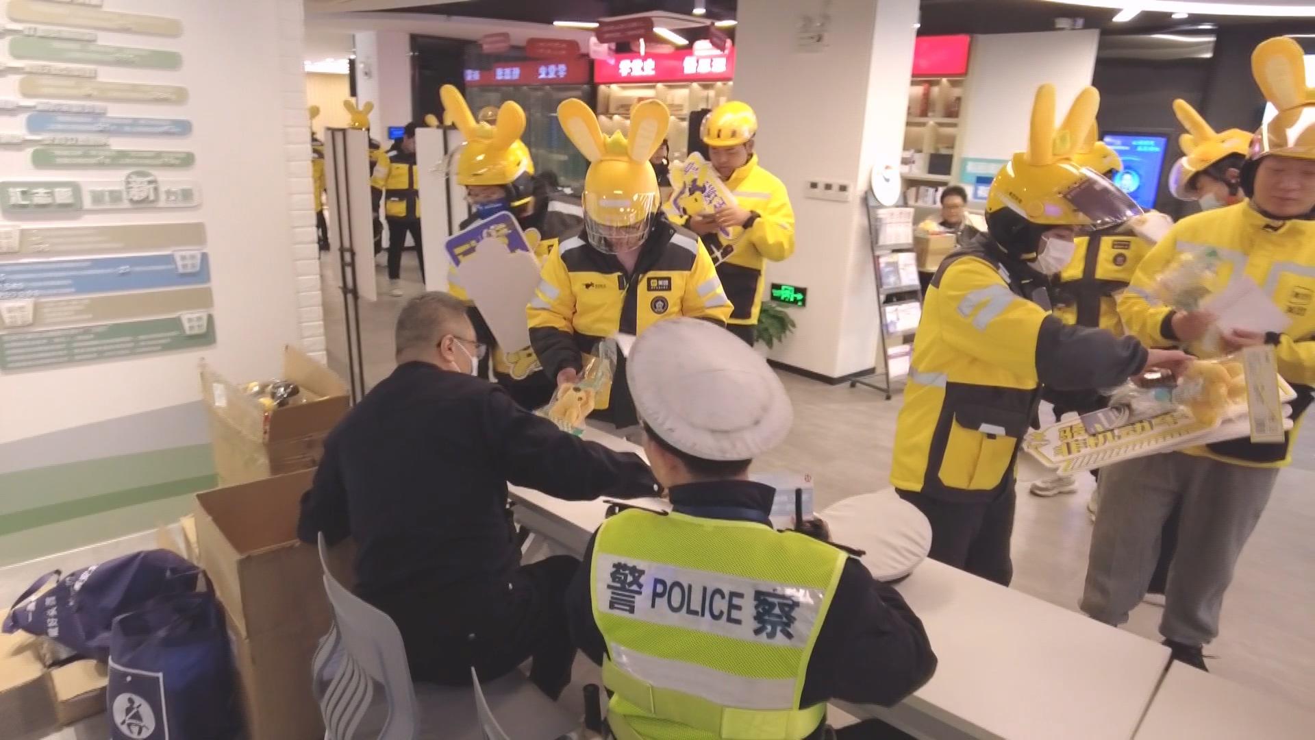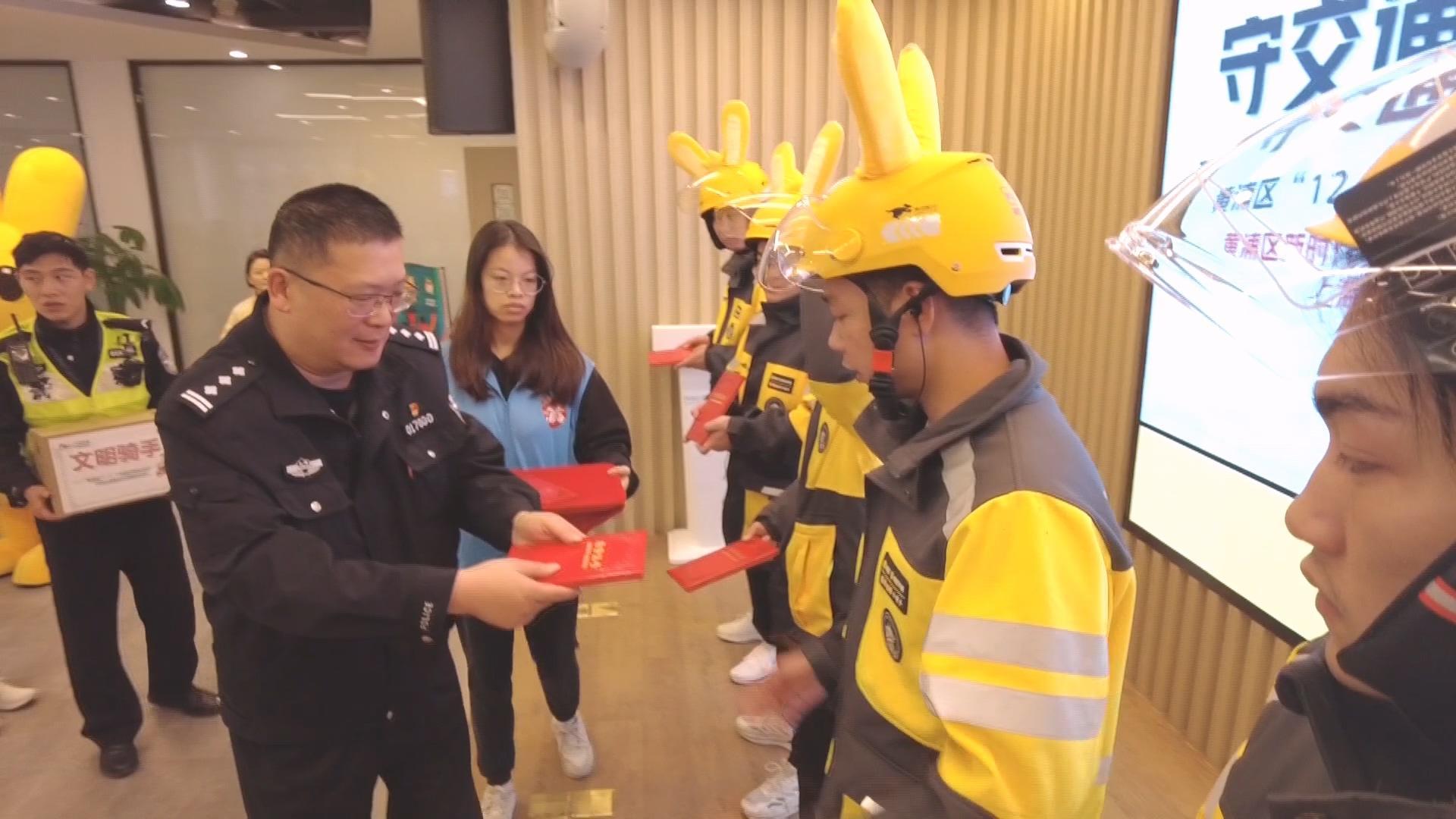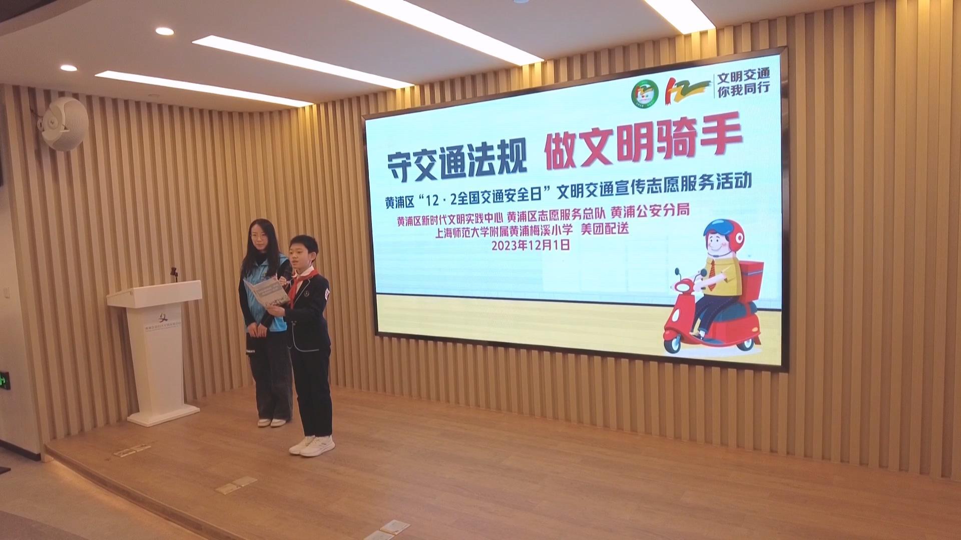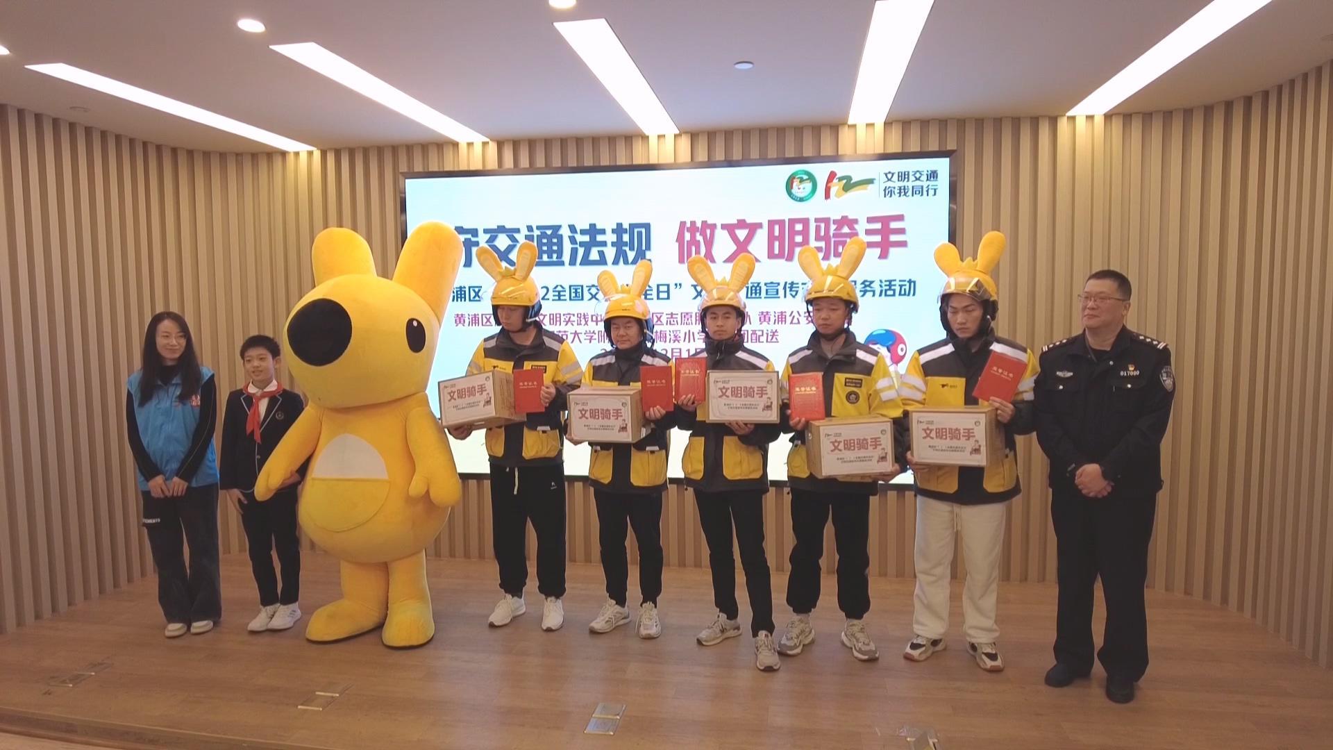 黄浦区学生代表向快递骑手发出文明骑行倡议。