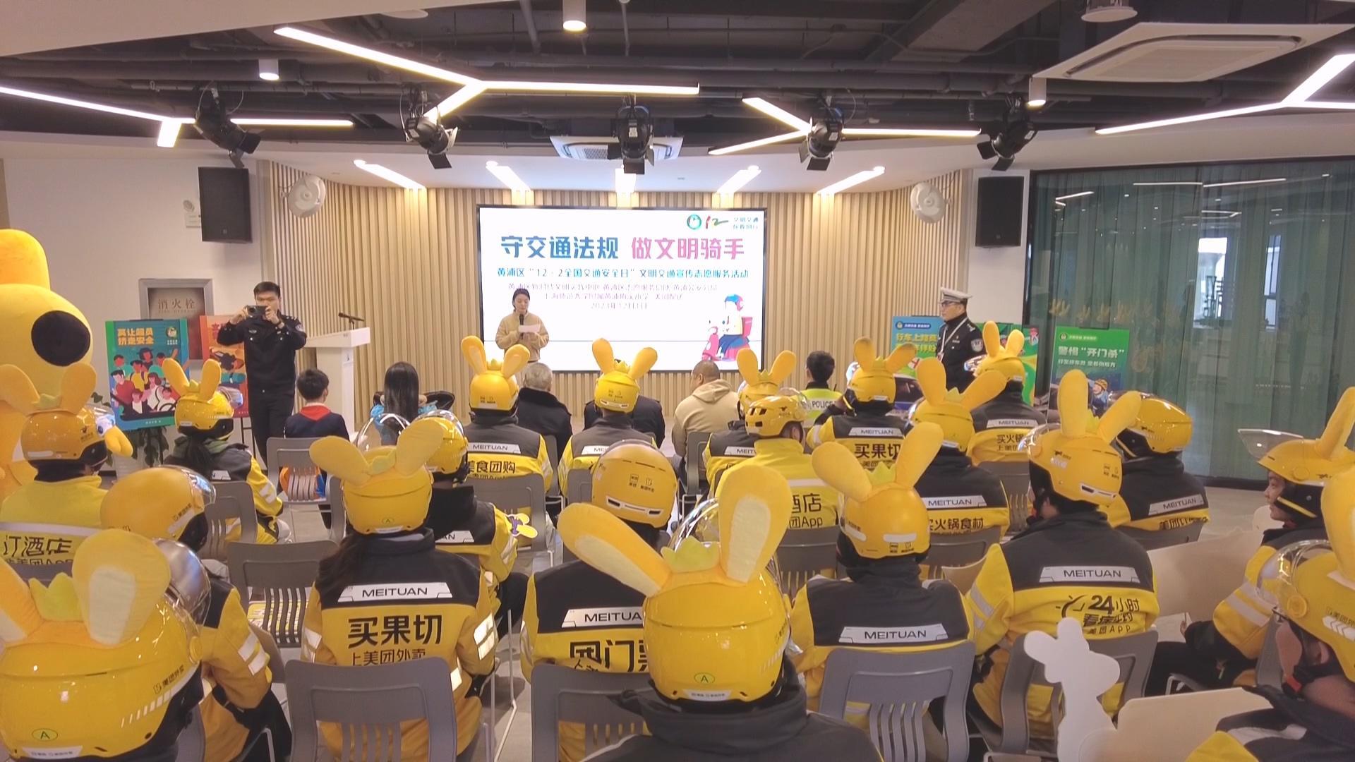 12月1日,黄浦交警支队与黄浦区新时代文明实践中心在瞿溪路举办交通安全宣传活动。活动中,黄浦交警向美团外卖骑手代表讲解近期全区非机动车事故案例,提示冬季交通安全要点。