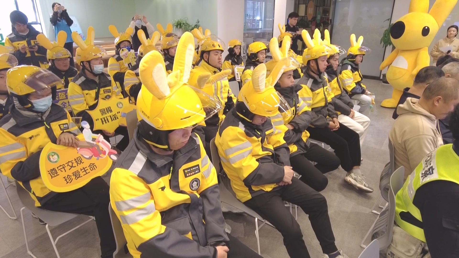 快递站点负责人代表接受倡议,并介绍了安全骑行的工作经验。黄浦交警支队和文明志愿者代表向骑手赠送安全头盔。