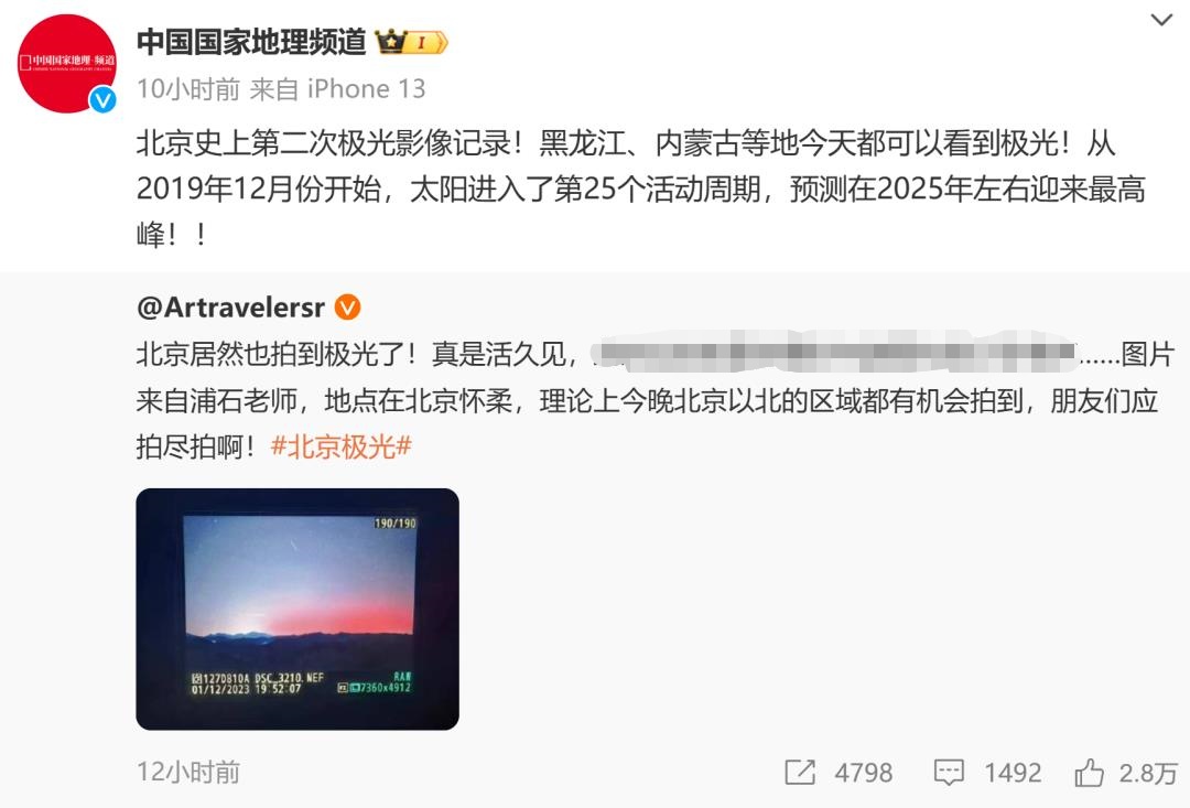 朱进表示,虽然极光常见于高磁纬地区,但如果地磁暴特别强,极光发生的范围会扩大,据记载,地磁暴厉害的时候,甚至在赤道地区都能看到极光。因此,在北纬40°的北京地区看到极光是可能的。