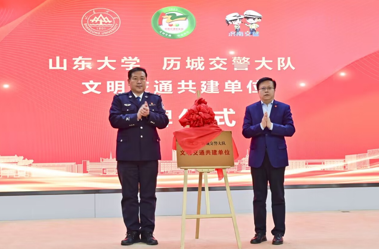 活动中,与会领导共同为山东大学和历城区大队文明交通共建单位进行揭牌,同时为泉城山东大学文明交通志愿团队授旗。