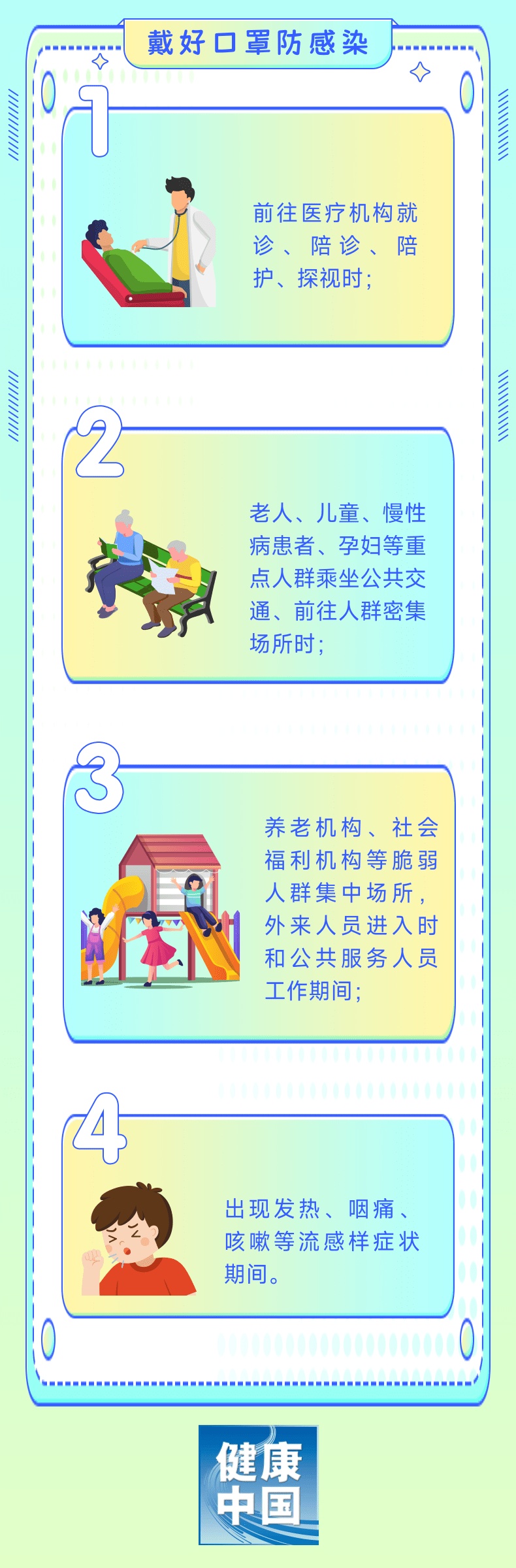 坚持多通风、戴口罩、勤洗手的卫生习惯,有助于降低感染风险。以下这几种情况建议科学佩戴口罩。