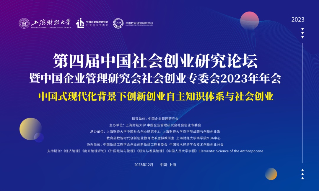 12月2日至3日,由中国企业管理研究会指导,上海财经大学、中国企业管理研究会社会创业专委会主办,上海财经大学中国社会创业研究中心、上海财经大学商学院战略与创新创业系、教育部数智时代创新创业教育改革虚拟教研室、上海财经大学商学院MBA中心承办,中国系统工程学会创业创新系统工程专委会和中国技术经济学会技术创新创业分会协办的第四届中国社会创业研究论坛暨中国企业管理研究会社会创业专委会2023年年会在我校举行。论坛围绕“中国式现代化背景下创新创业自主知识体系与社会创业”主题展开,主要分为2场主旨演讲、2场主题演讲、5场平行研究论坛和1场实践论坛。