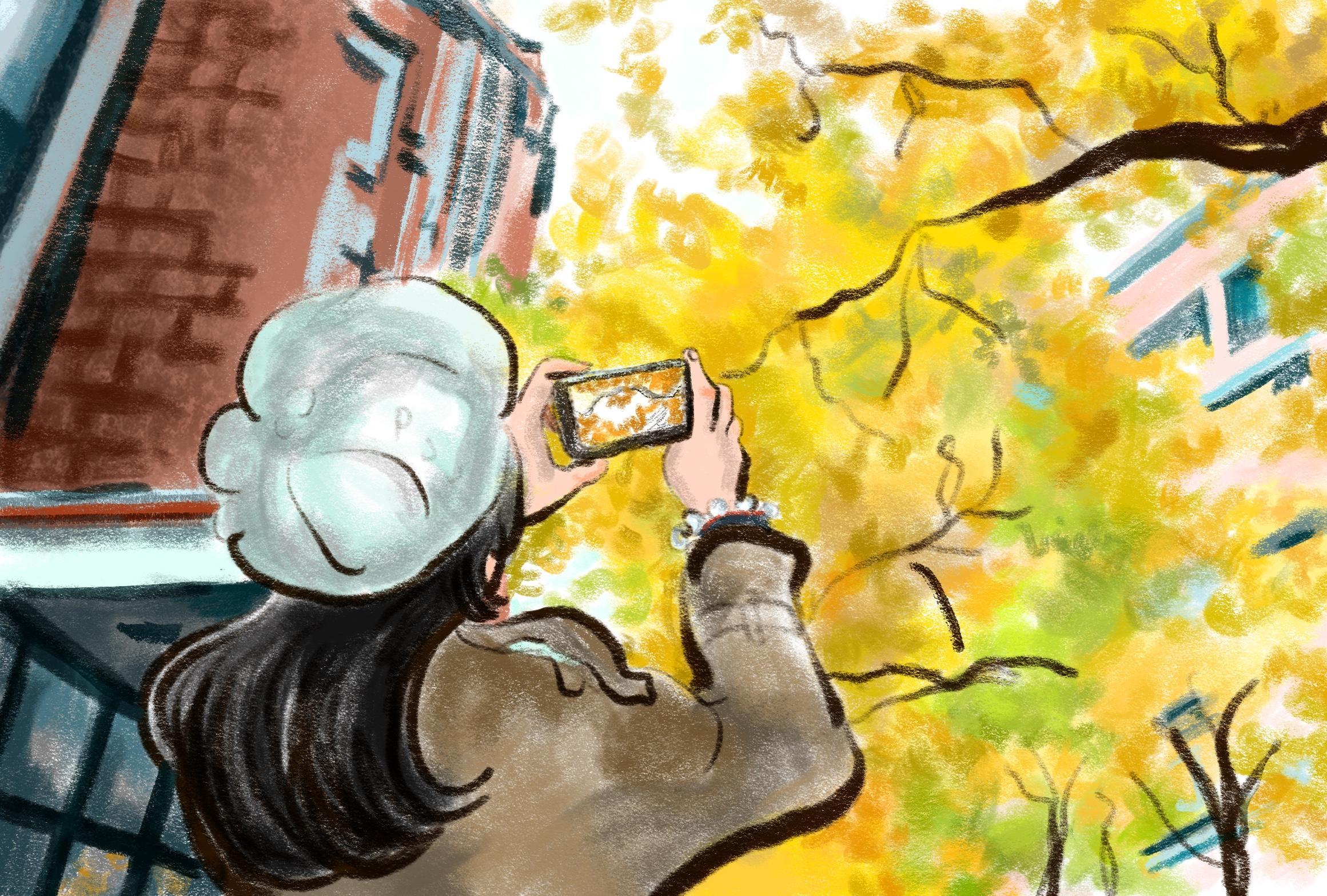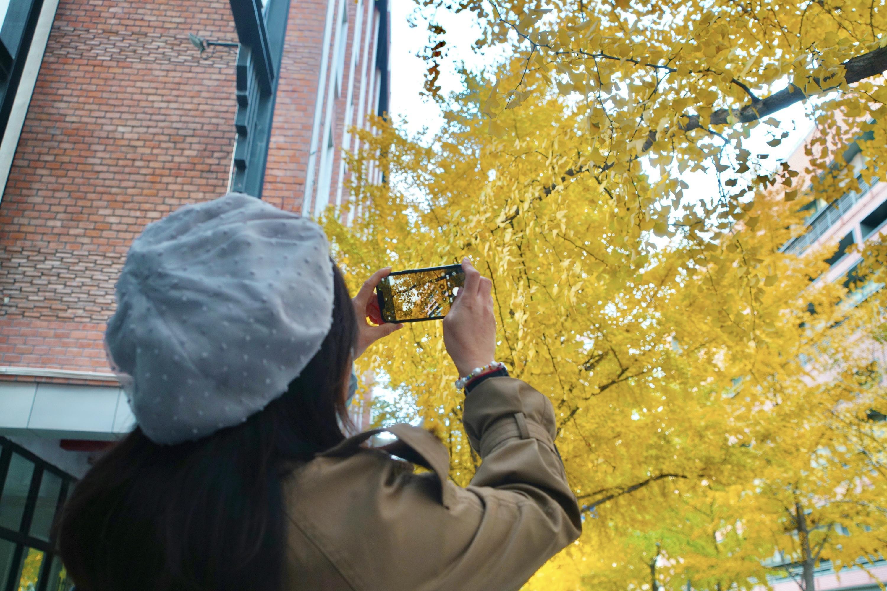 路过的贝雷帽女生拿起手机抬头记录下这一大片金灿灿,良辰美景不可辜负。