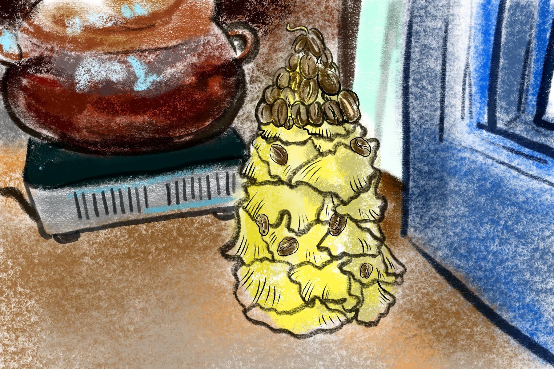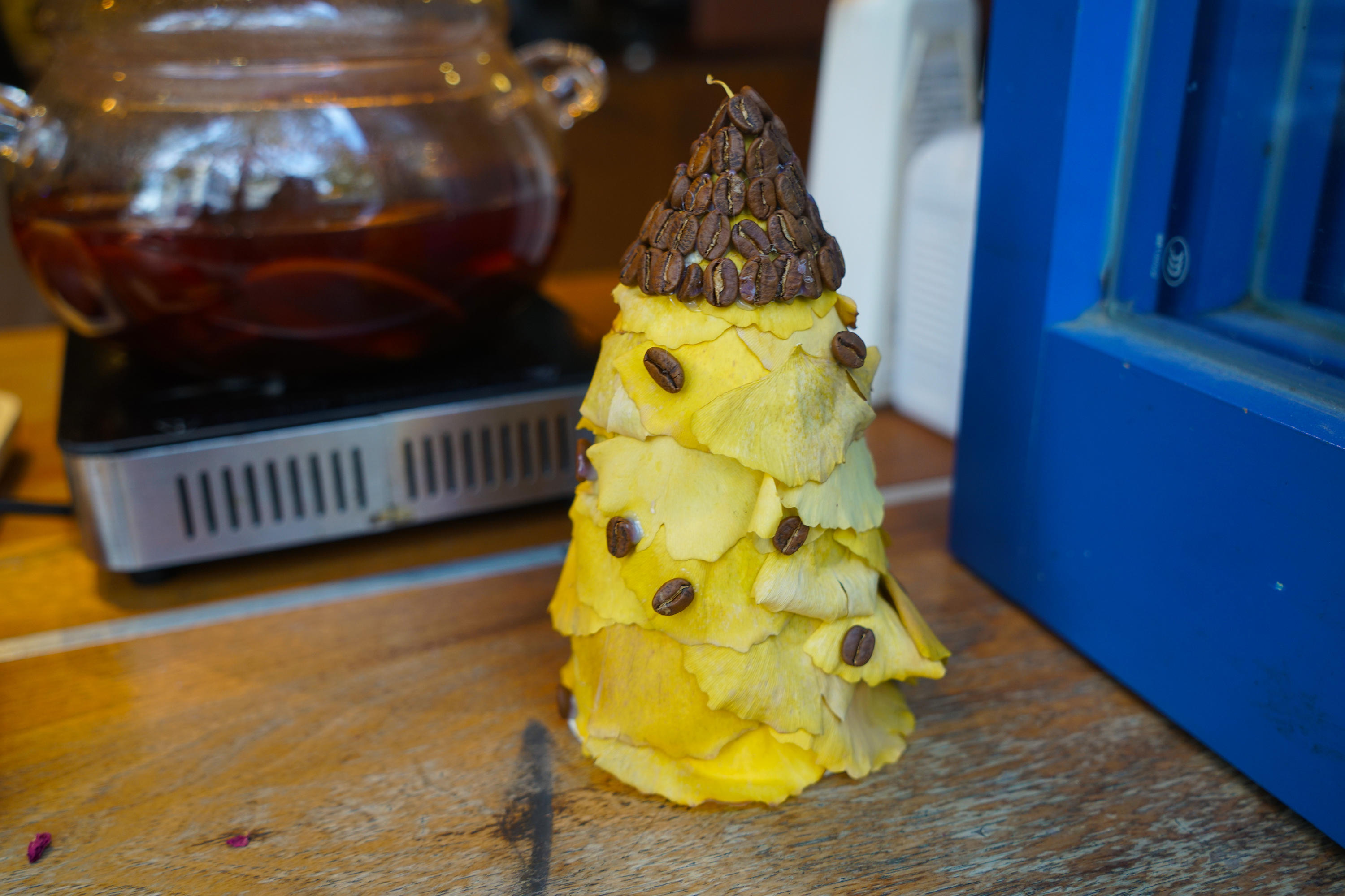 整条小街的半空中都像被洒满了层次丰富渐变的暖色调。店家用掉落的银杏叶和咖啡豆黏合成一棵小小的圣诞树。贴合主题,又应景。