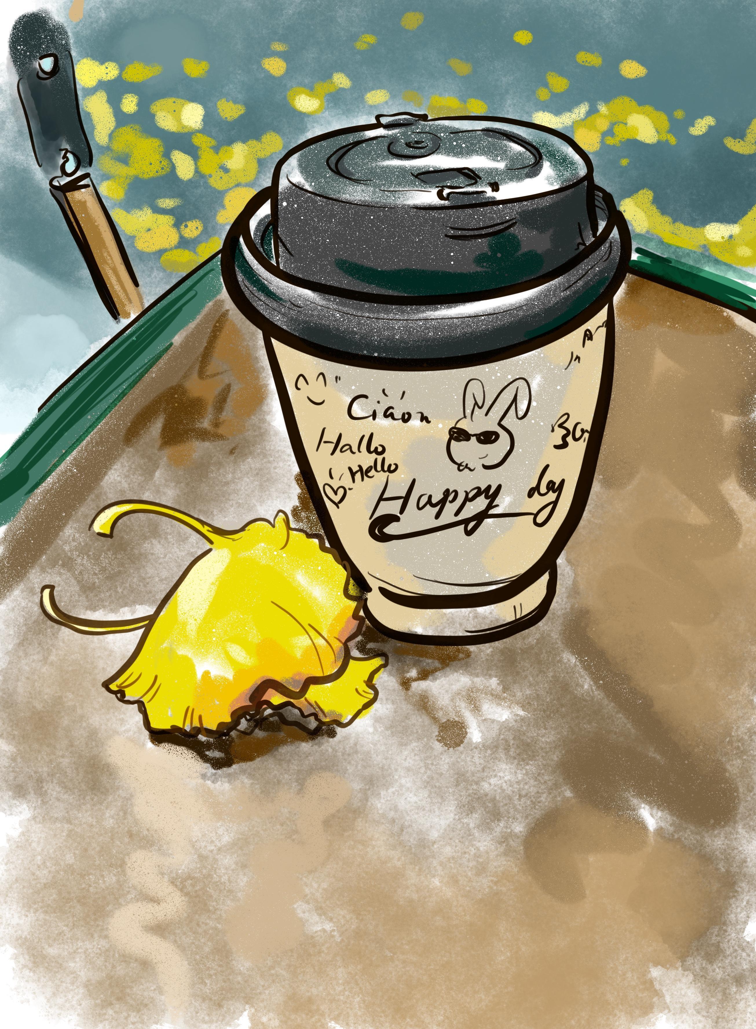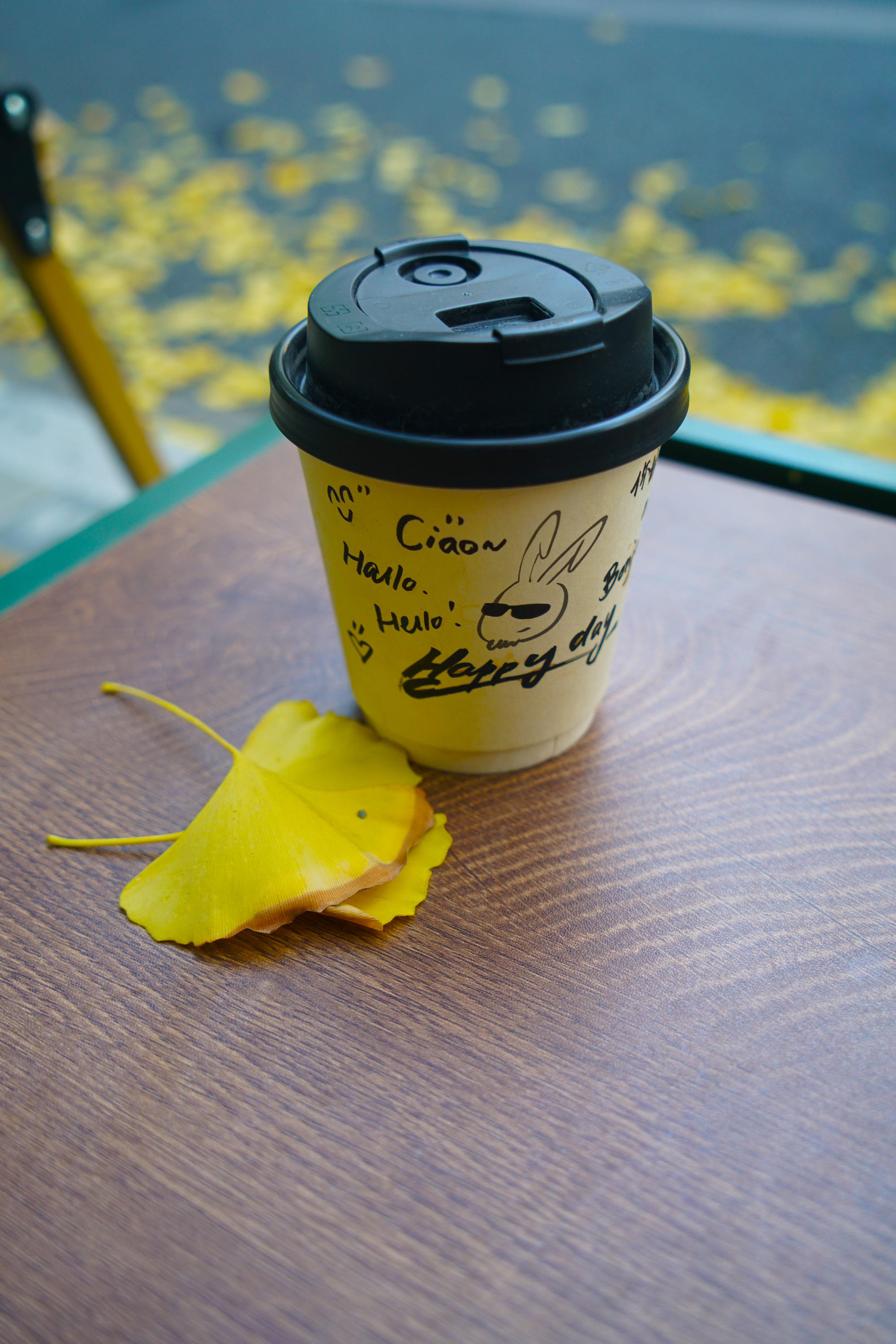 路人把喝完的咖啡杯留在了街边的小桌子上,两片金色的叶子给杯身的卡通兔子带去了文艺的气息。