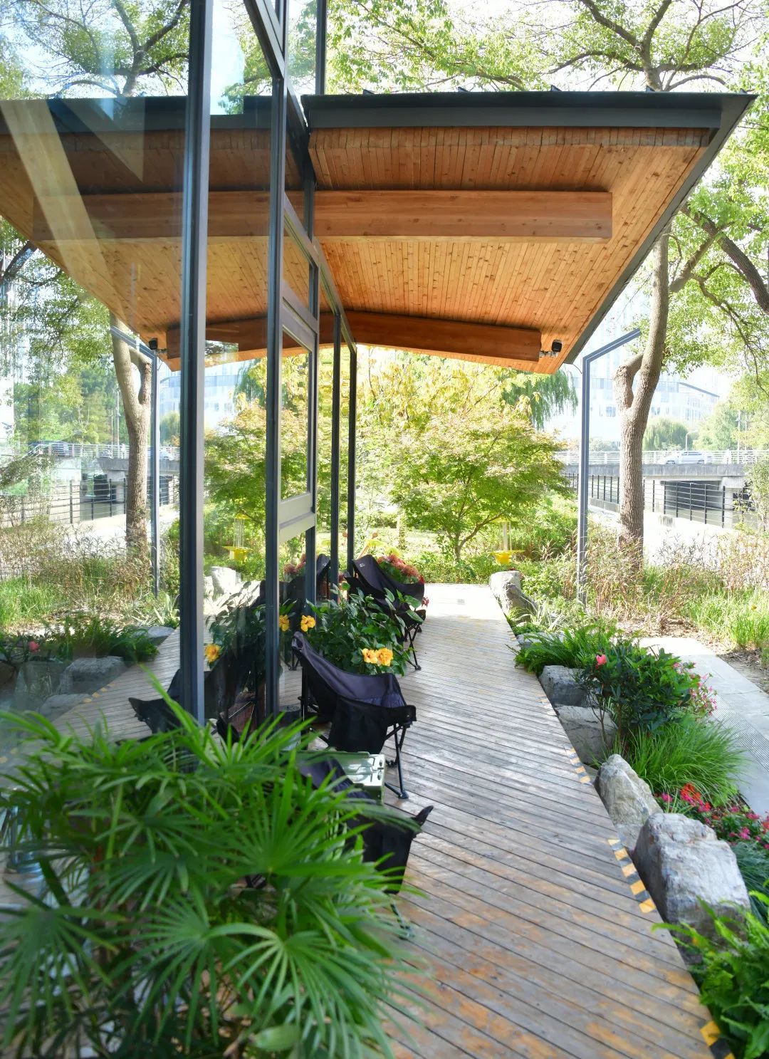 从地铁13号线真北路站1号口出站步行少许,一座被绿意包围的木制玻璃房便映入眼帘。