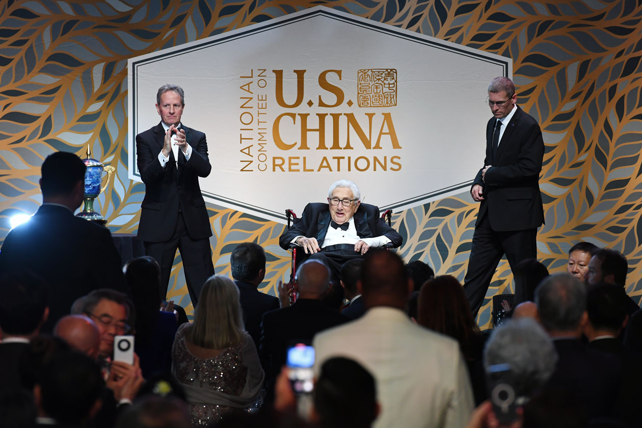 2023年10月24日,美国前国务卿亨利·基辛格(中)出席在纽约举行的美中关系全国委员会年度颁奖晚宴。
