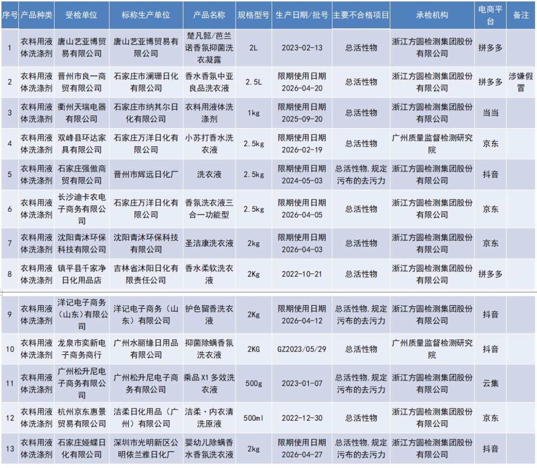 此次共抽查136批次产品,涉及广东、河北、浙江等20个省份的125家生产单位,抽查发现13批次产品不合格。其中:有1批次产品涉嫌假冒,已交由属地市场监管部门处理;有13批次产品总活性物项目不合格,4批次产品规定污布的去污力项目不合格。