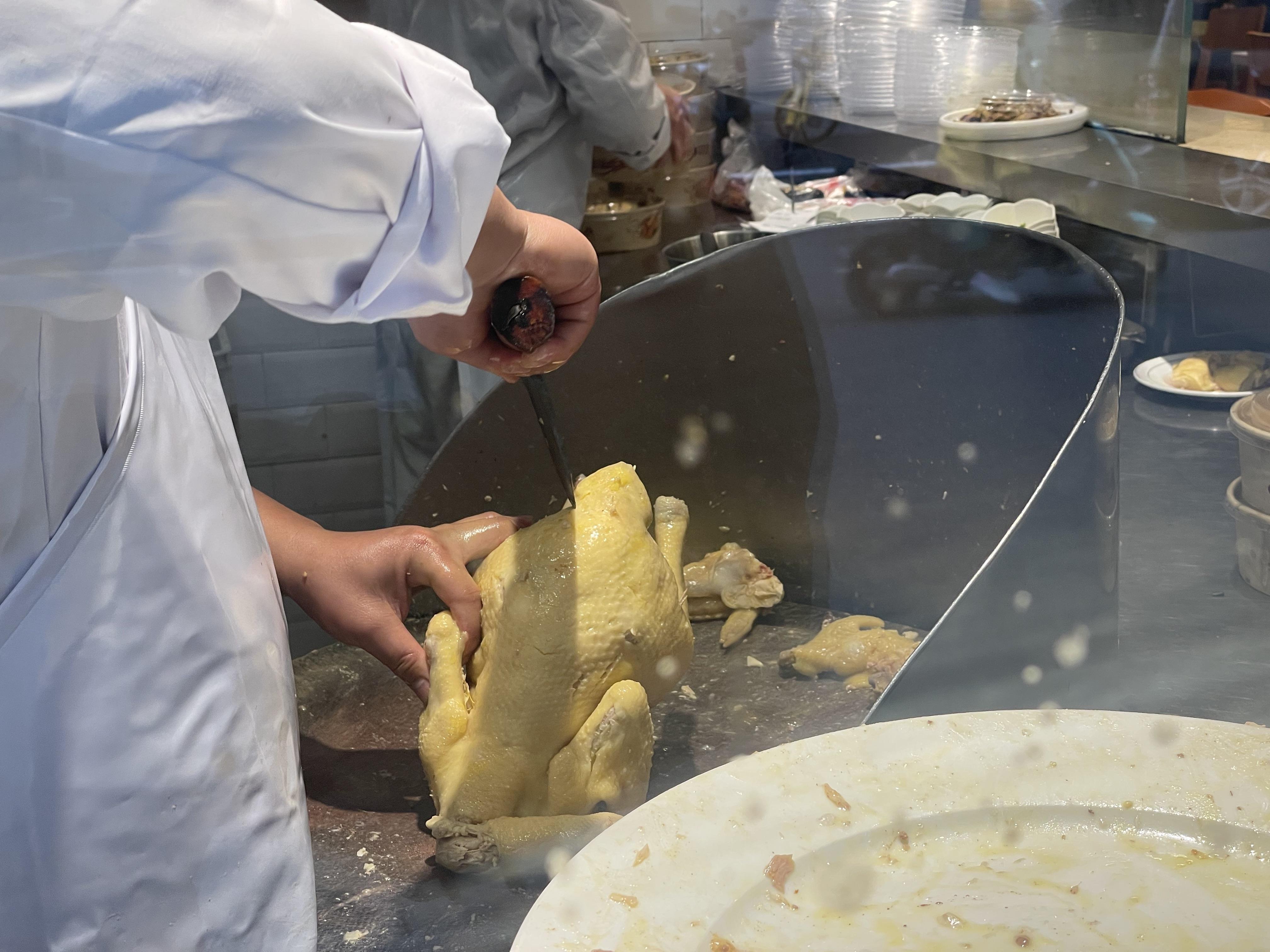 时至今日的上海,白斩鸡是满大街都能吃到的。做法也大抵相同:第一步,活鸡宰杀、煺毛,取出内脏,光鸡洗净备用;第二步,在汤锅内加水,旺火烧开,烫鸡定形,再烧开水投入光鸡,用中火煮熟,再捞出投入专用水中;第三步,熟鸡斩件装盆,食用时蘸取调料。虽然现在白斩鸡满大街都能吃到,但要说起源最早、味道最正宗的,还数小绍兴,这美味就跟城隍庙里的南翔馒头店一样有非凡的魔力,让顾客千里迢迢排队买单也觉得甘之如饴。堂吃白斩鸡一斤起卖54元,端上来时色泽淡黄、油光蹭亮,酱油碟子里蘸一蘸送入口中,皮脆肉嫩,真真是“鲜得眉毛掉下来”!