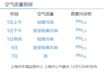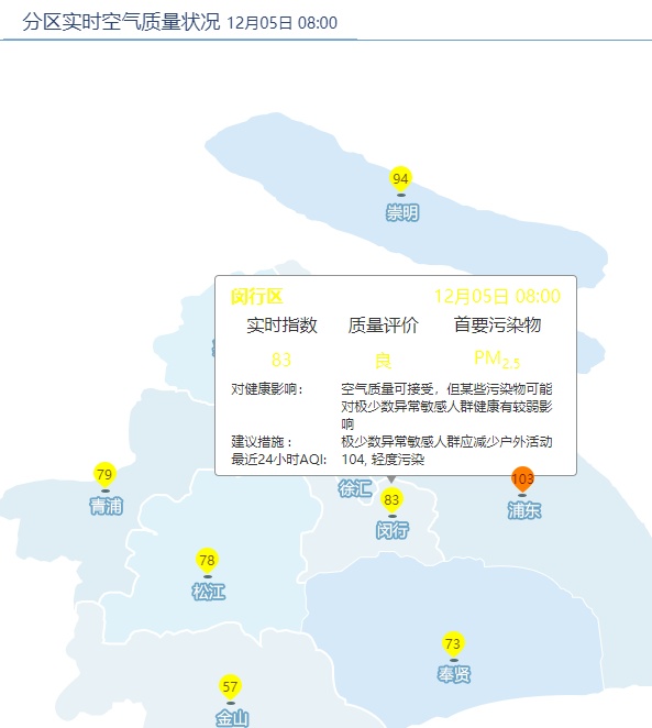 12月5日8时,闵行区AQI为95,良,首要污染物PM2.5。昨天AQI为87,良,首要污染物PM2.5。据上海市环境监测中心预报,今天下午良至轻度污染,夜间轻度污染,明天良至轻度污染,后天良。
