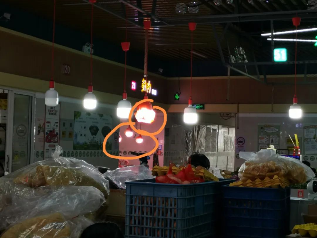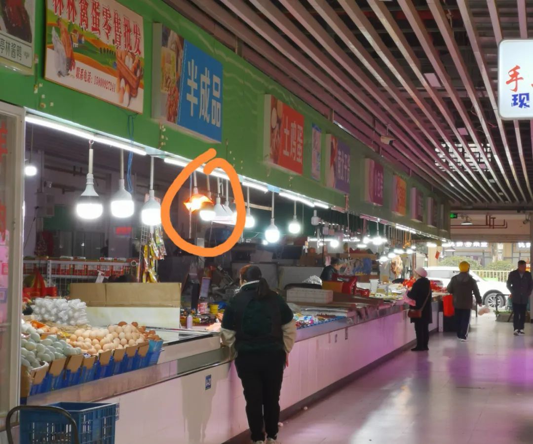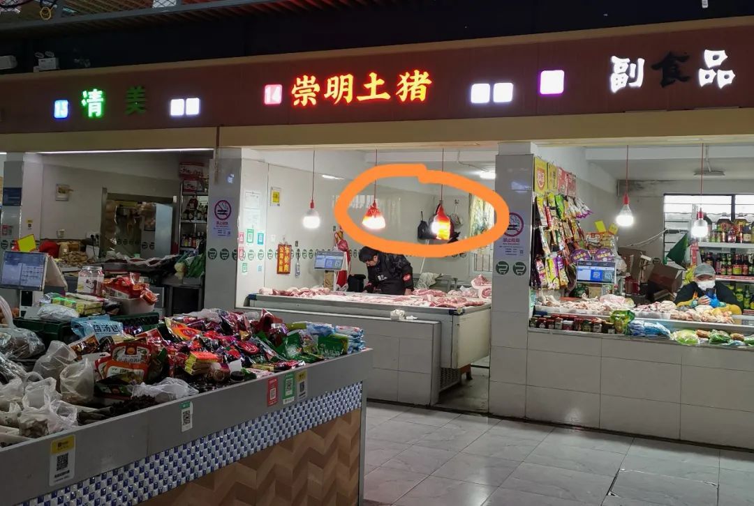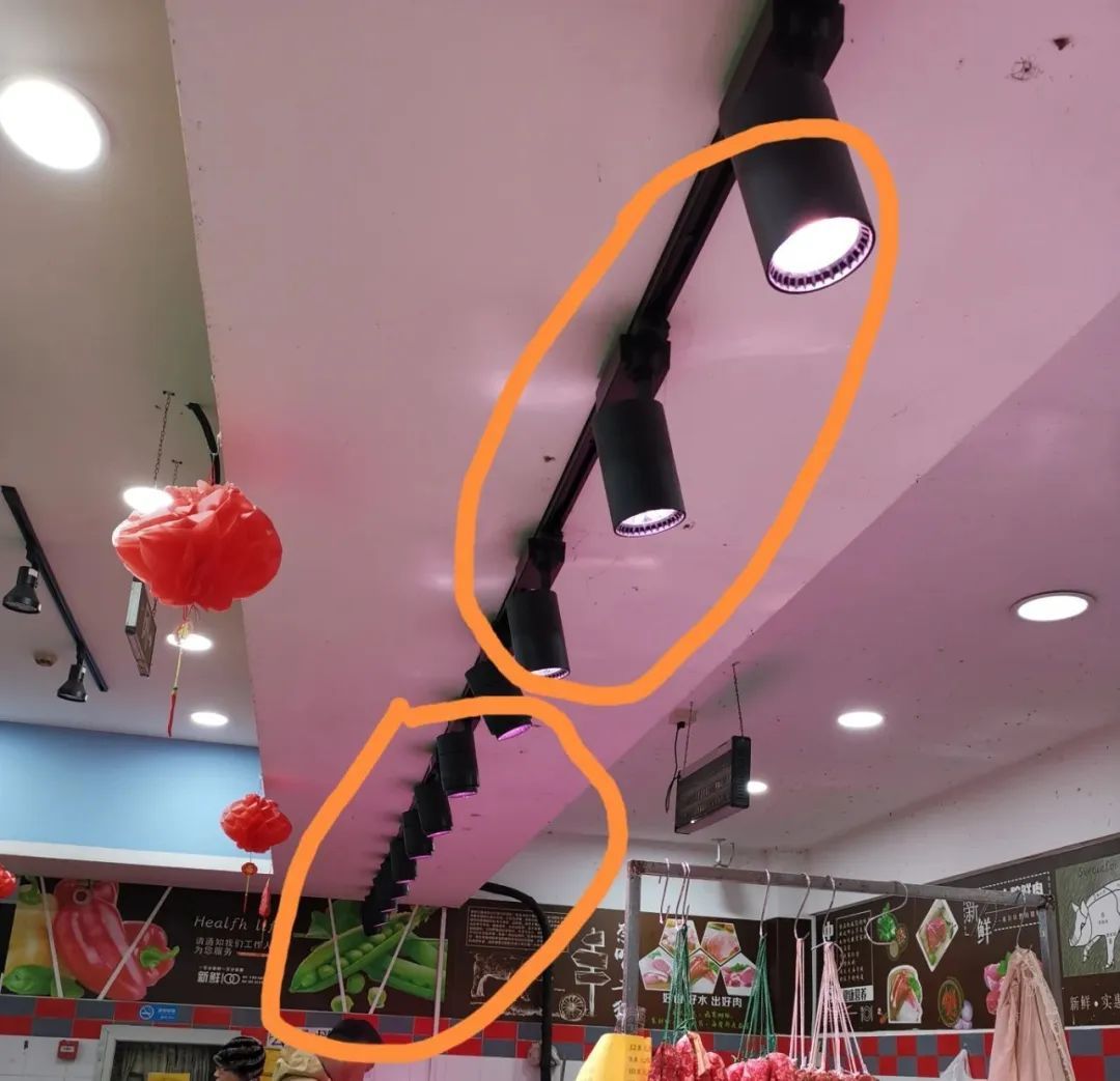 12月4日中午,小编也来到网友提到的几处点位进行实地走访,发现市场虽然换上了普通照明灯,但仍有个别摊主各出奇招,给白炽灯穿上了“红马甲”,自制“生鲜灯”给生鲜食品“美颜”。除了自制“生鲜灯”,部分超市还存在使用隐蔽性“生鲜灯”的情况。