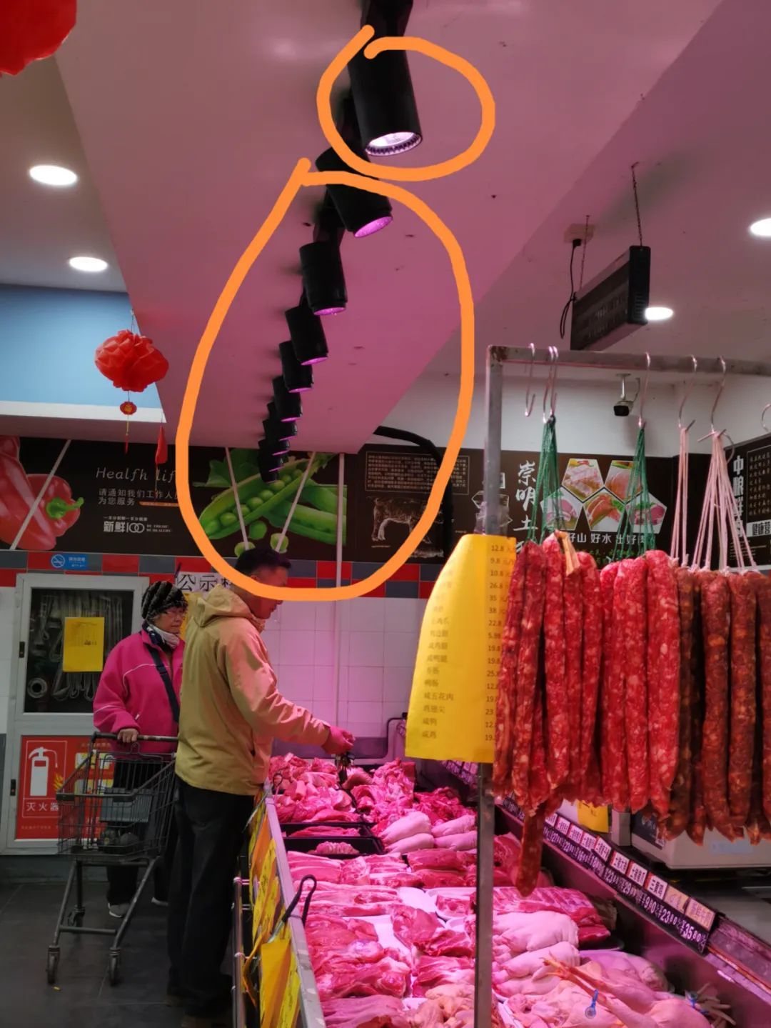 抬头一看,相连的一排照明灯明显散发出不同的光彩,鲜肉区为红色生鲜灯,冷冻区则为普通照明灯。如果不是靠近仔细观察,并不容易发现一排灯光的差异。