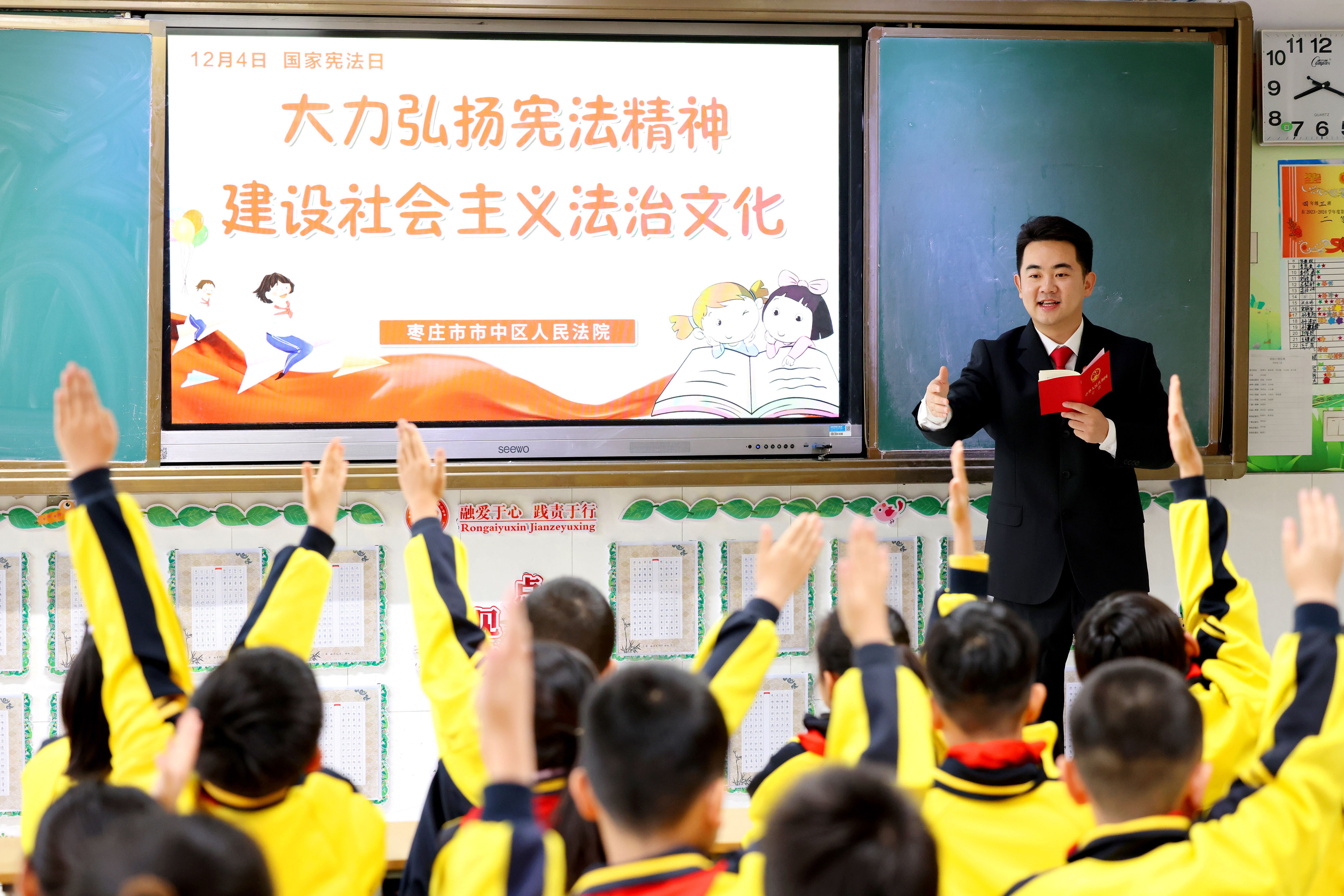 12月4日是第十个“国家宪法日”。12月1日至7日是第六个“宪法宣传周”,主题是“大力弘扬宪法精神,建设社会主义法治文化”。当日,枣庄市市中区人民法院组织法官走进文化路小学,开展主题宣传活动,弘扬宪法精神,增强法治观念。(大众报业·大众日报客户端记者 张环泽 通讯员 吉喆 孔维扬 报道)
