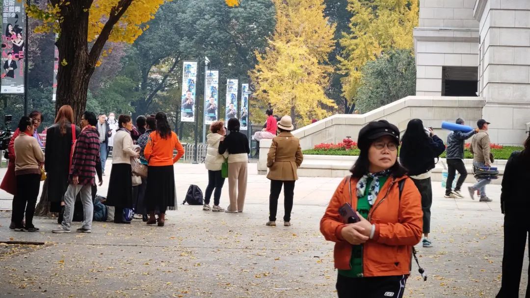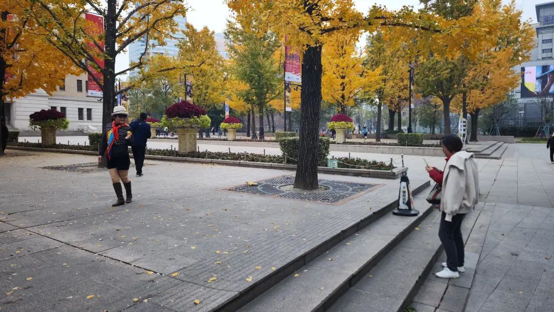 前来拍照打卡的阿姨对这片金黄色的美景称赞不绝,“音乐厅门口的银杏叶非常好看,风一吹叶子就慢慢飘落下来,非常美,我们几个小姐妹特地约好今天过来拍拍照片,大家都很开心的。”