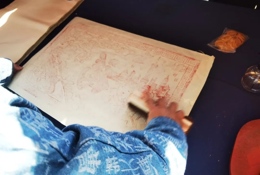 将宁化省级非物质文化遗产玉扣纸平铺在雕版上,用墨刷刷上水墨,平刷烫印,很快,一幅精美的作品就展现在了大家面前。