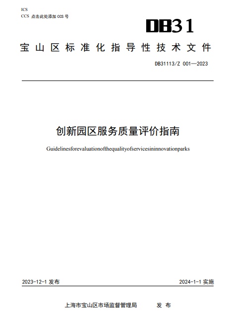 近日,由宝山区市场监管局提出并牵头修订的DB31113/Z01-2023《创新园区服务质量评价指南》于2023年12月1日发布,并将于2024年1月1日正式实施。