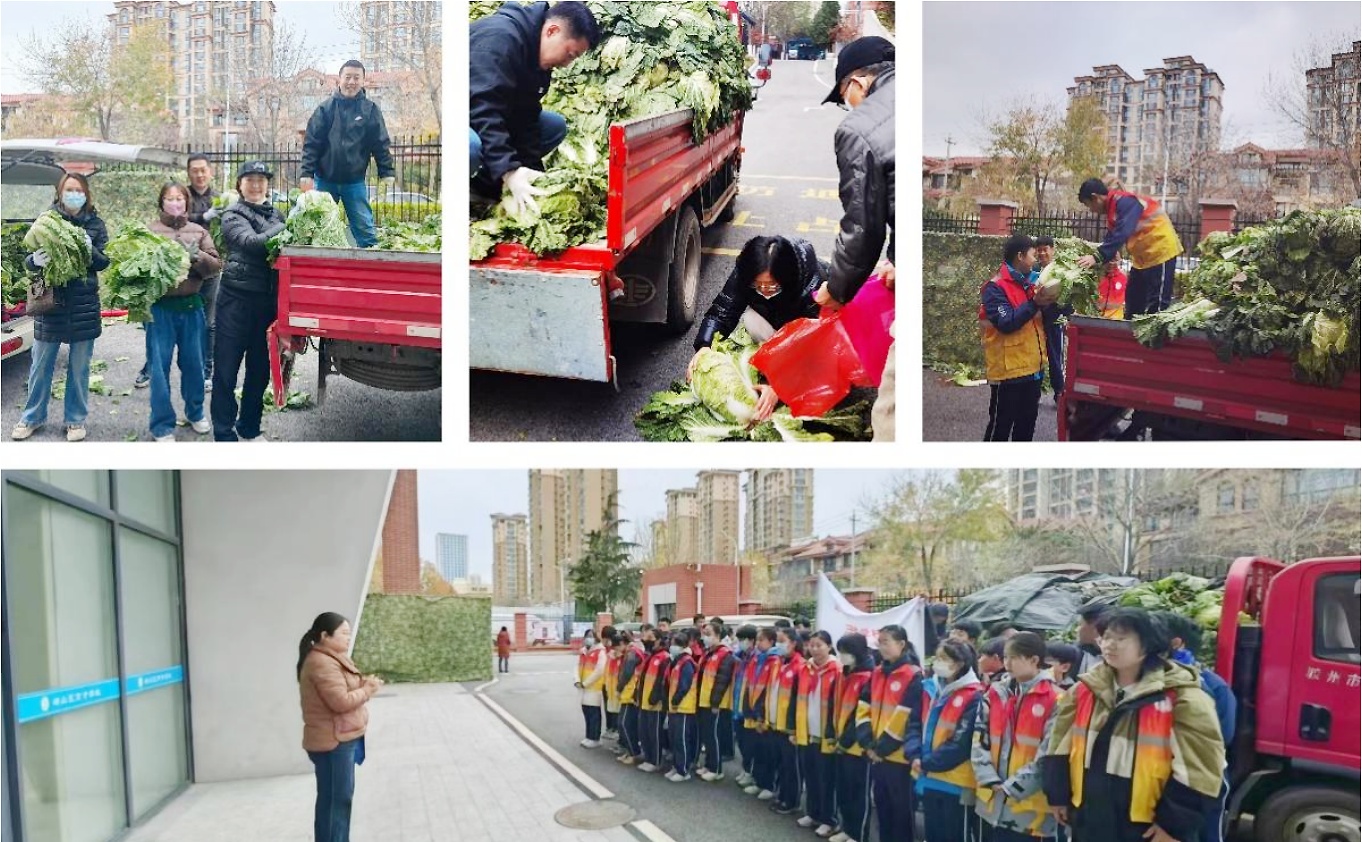 近日一早,崂山区育才学校初中部门口异常热闹,与往日不同的是,除了孩子们背着书包匆匆上学的身影,还有一群家长志愿者忙里忙外在帮助菜农把白菜卸车、清点数量、分堆码垛……这是学校初中部2022级师生家长积极参加消费扶贫助农活动的场景。