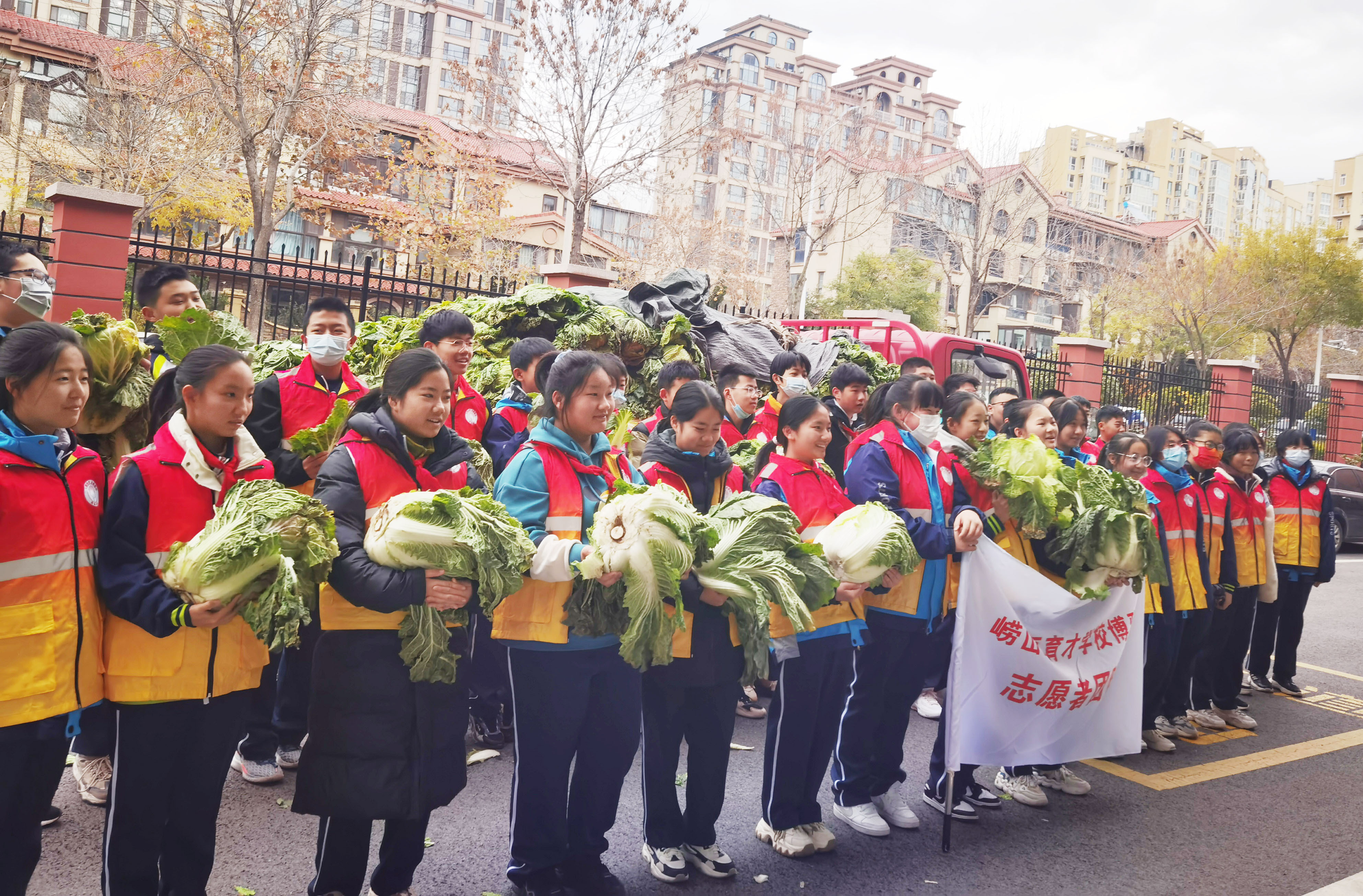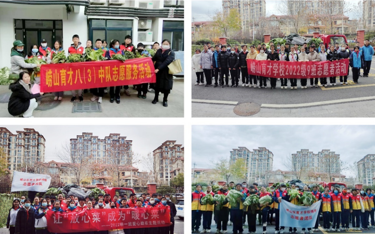 崂山区育才学校学生志愿团队订购的1198棵白菜,除了认购了261棵家庭自用,剩余937棵白菜,各班级志愿团队于周末继续将爱心传递下去……