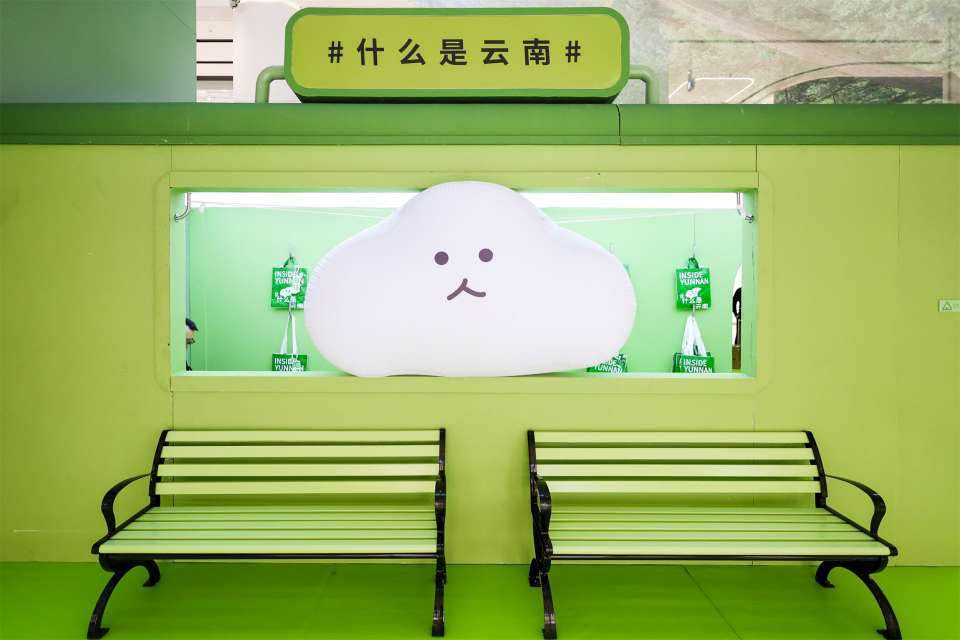 现场,整个广场被展览主题色绿色所包裹,无论是被云朵拖着的超巨幅宣传海报、花朵环绕的装饰、一整面的香料墙,还是位于中庭的核心展区,都让人有“闪现”云南之感。