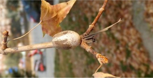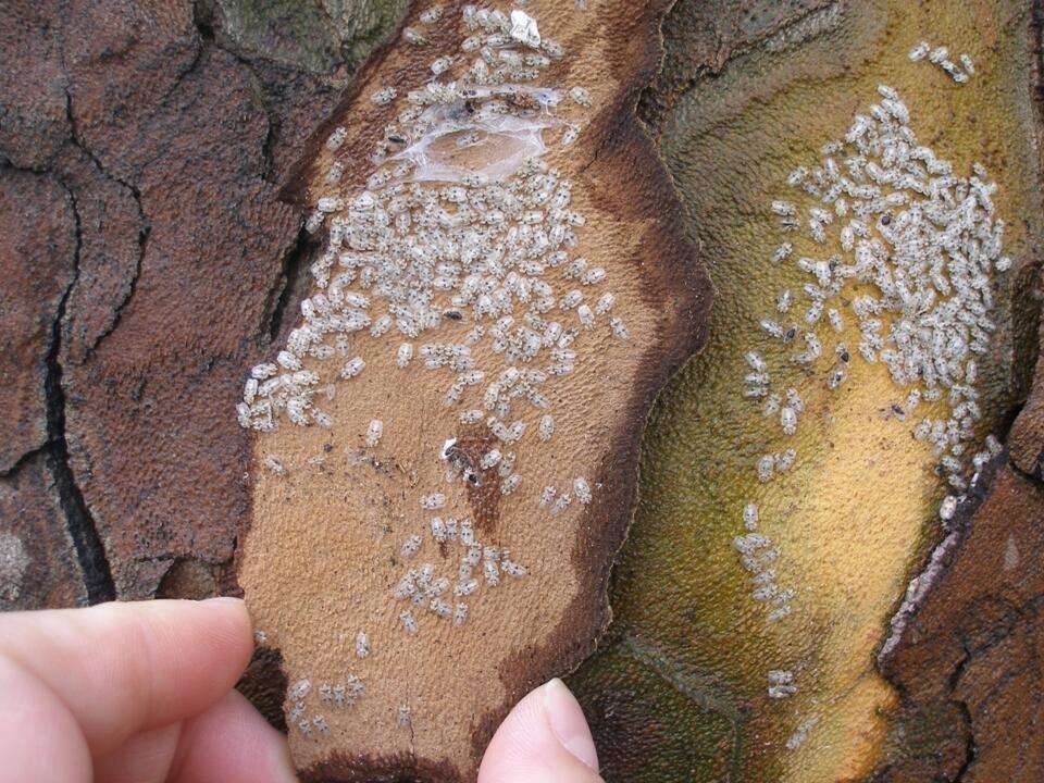 有的昆虫比较偷懒,就近藏在寄主植物的起翘树皮下避寒,掀起一块悬铃木树皮,你或许就能发现躲藏在树皮下的悬铃木方翅网蝽成虫。绿化工人会根据它越冬特性,在清理树皮破坏它的越冬场所。