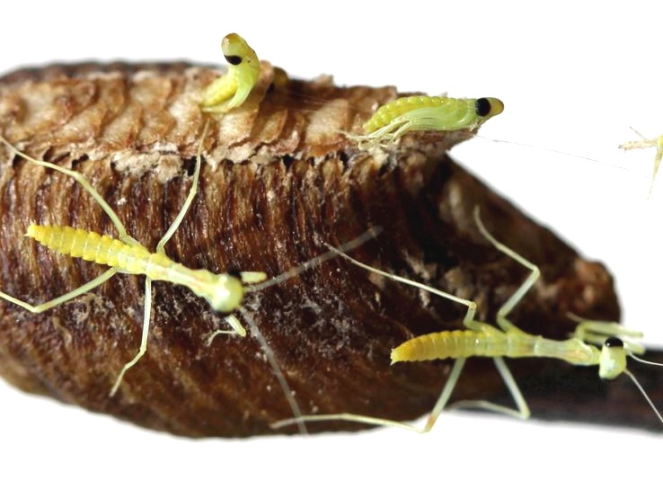 春季螳螂若虫从卵壳中孵化