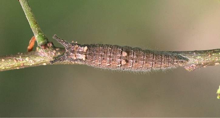 看!黑脉蛱蝶的虫宝紧紧地匍匐在树枝上,它的体色也模拟树皮的颜色,和周围环境融合在一起。