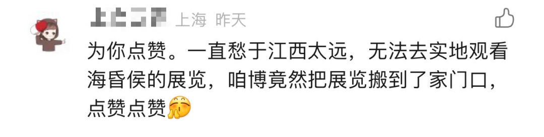 “为你点赞,一直愁于江西太远,无法去实地观看海昏侯的展览,咱博竟然把展览搬到了家门口,点赞点赞!”