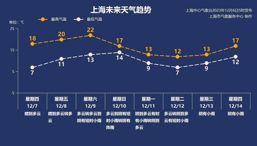 未来三天气温将会连续上升,预计本周六最高气温达到22℃的回暖顶峰,但时间已来到12月上旬,回暖终究是暂时的。上海中心气象台预计,9日起申城的天气格局将发生变化,未来将多小雨天气。