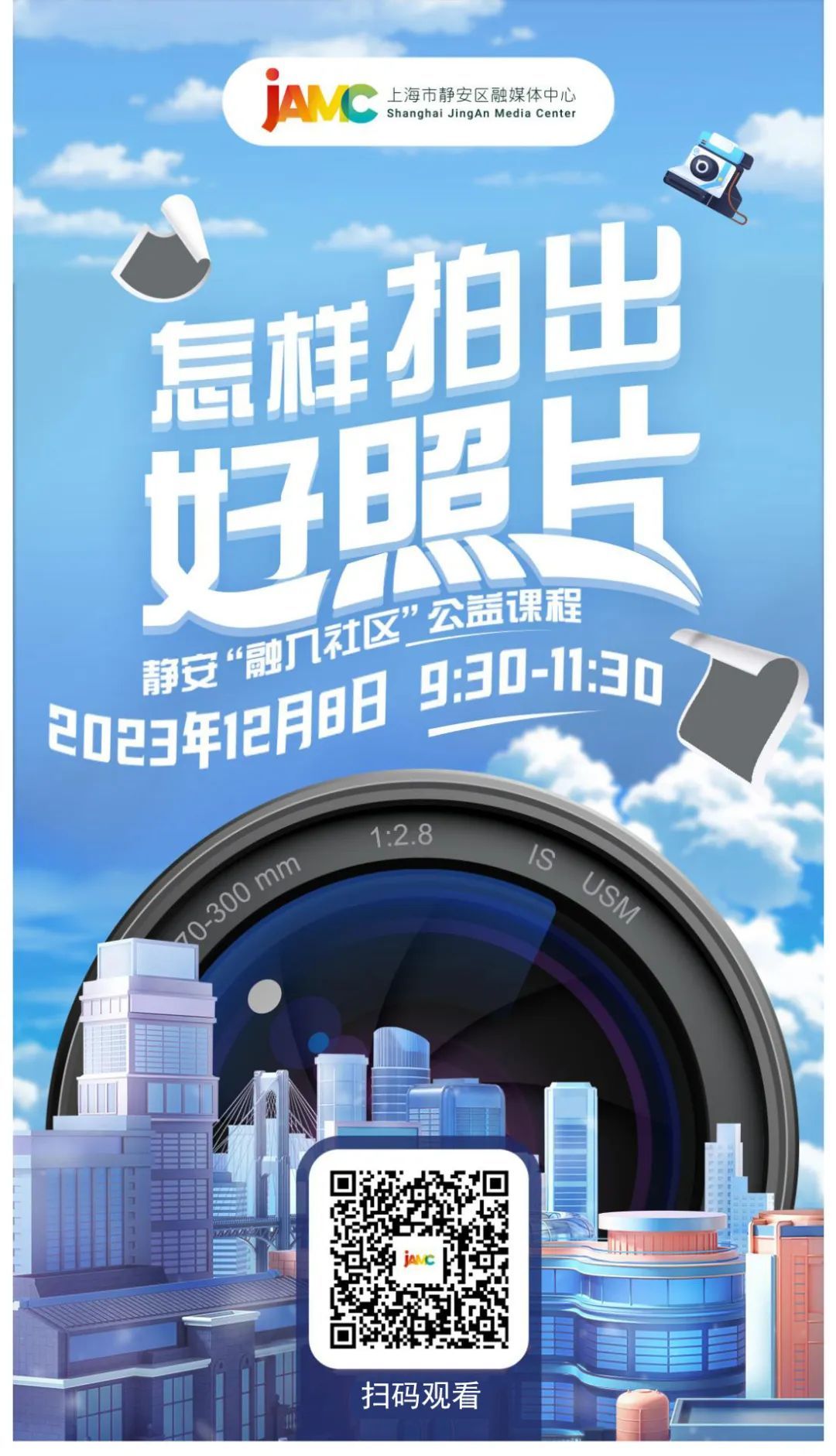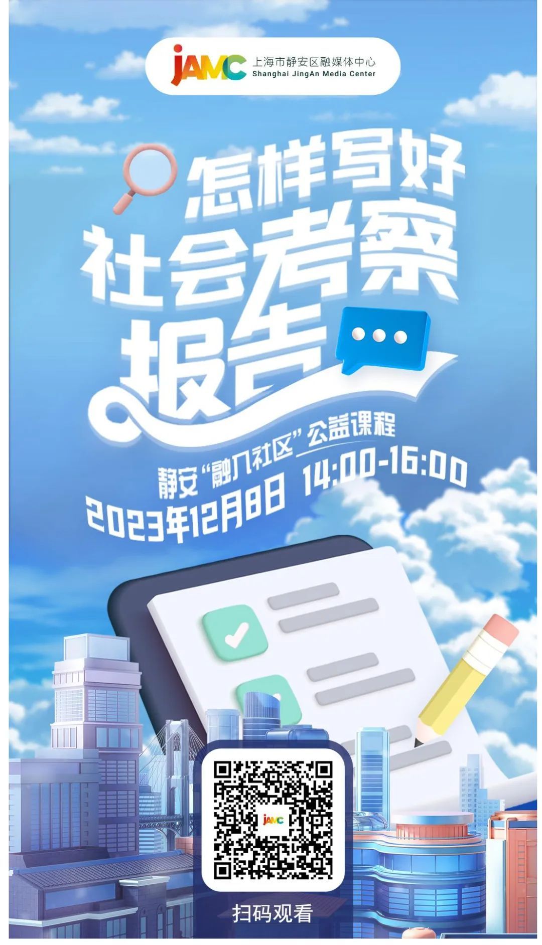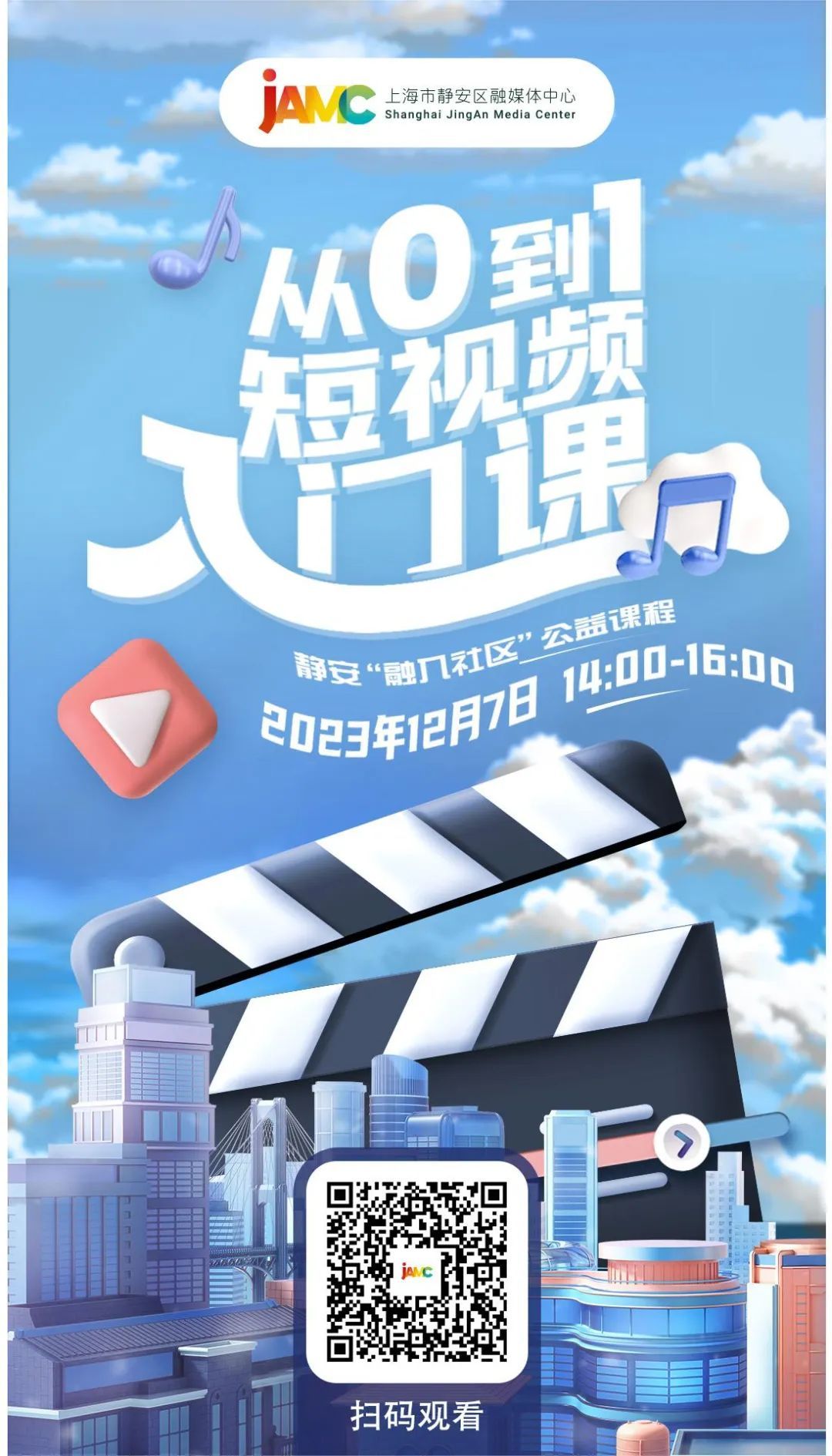2023年, 由静安区融媒体中心推出的 “融入社区”公益课程 , 先后走进临汾路街道、 彭浦镇和大宁路街道, 9场优质课程 为社区居民、企业白领和学校师生 带来了诚意满满的“知识干货”! 没能成功报名? 错过课程怎么办? 三场精品课程内容 JAMC课程团队已经为大家 准备好了! 12月7日—8日, “融入社区”系列公益课程 将在“上海静安”客户端 三场连播! 大家可以选取 自己感兴趣的课程, 准时打卡课程直播间! 参与直播间讨论, 还有机会获得直播专属福利! 每场课程直播, 小助理将抽出10位幸运用户, 赠送JAMC限定礼1份 (详见直播间公告)